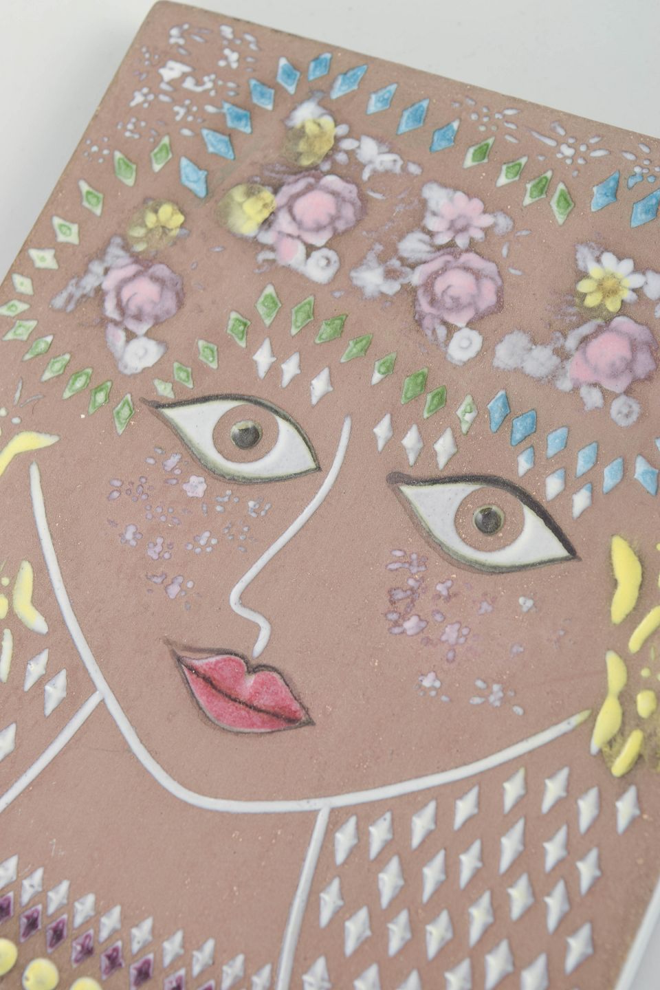Rektangulært figurativt vægrelief model 5050 M med stiliseret kvindeportræt dekoreret med blomster og geometriske ornamenter i relief og farvet glasur.