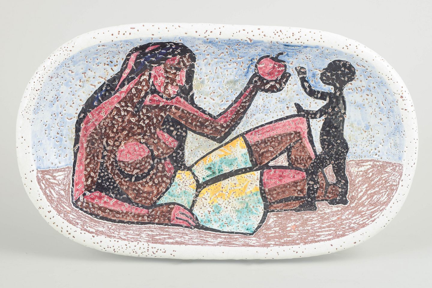 Erik Pløen, monumentalt unika vægrelief.Unikt figurativt vægrelief i glaseret stentøj med stiliseret mor- og barnemotiv udført i kraftige jordfarver og kontrasterende konturtegning.