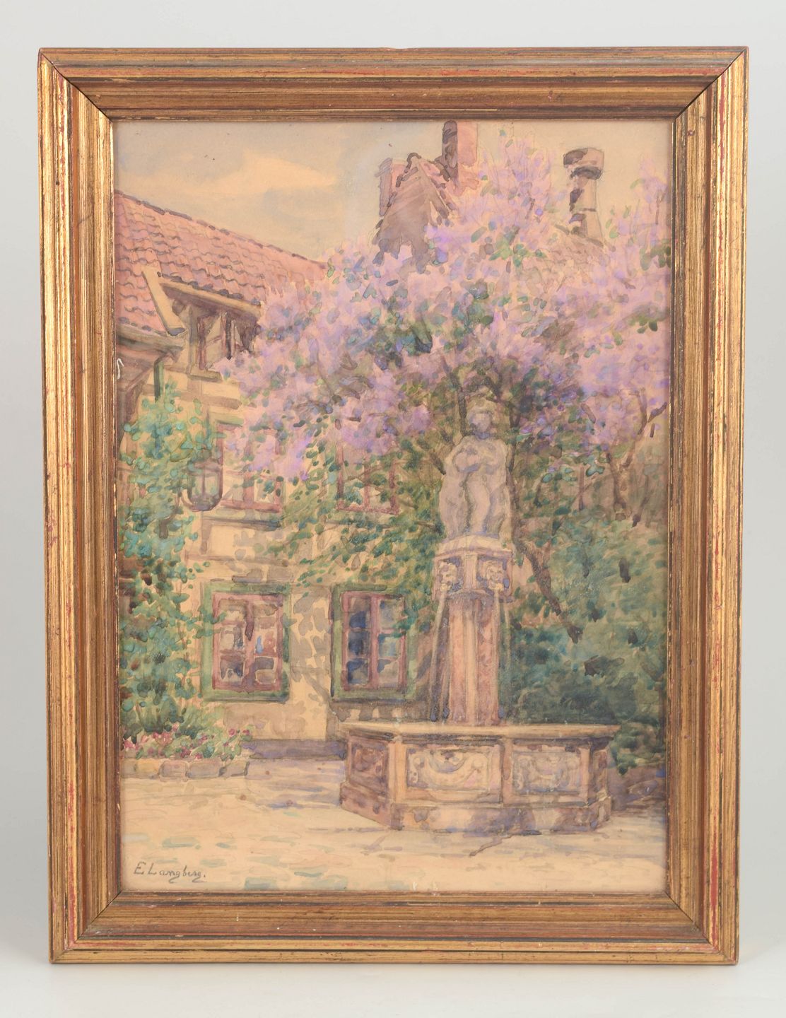 Stemningsfuldt bymotiv fra en tysk by med arkitektur og fontæne i blomstrende gårdrum, udført som akvarel på papir, signeret.