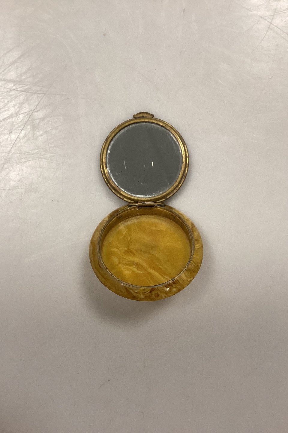 Art Deco Pilleæske med Spejl. Formentlig bakelit i gul marmorering. Motiv med kvinde i gul kjole på baggrund af sølvglitter. Måler 4,5 cm / 1,77 in.