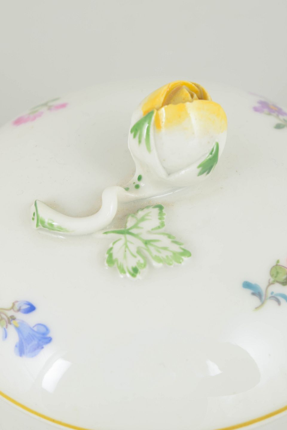 Rund lågskål i hvidt porcelæn dekoreret med spredte håndmalede polykrome blomster og diskret forgyldning langs rand og fod. Knopgreb udformet som en roseknop. Mærket i bunden med Meissens krydsede sværd.