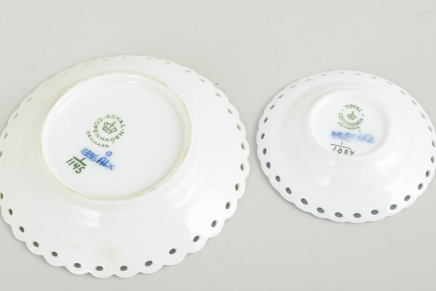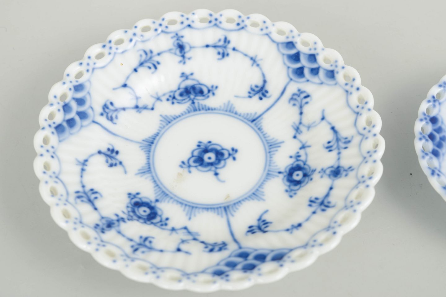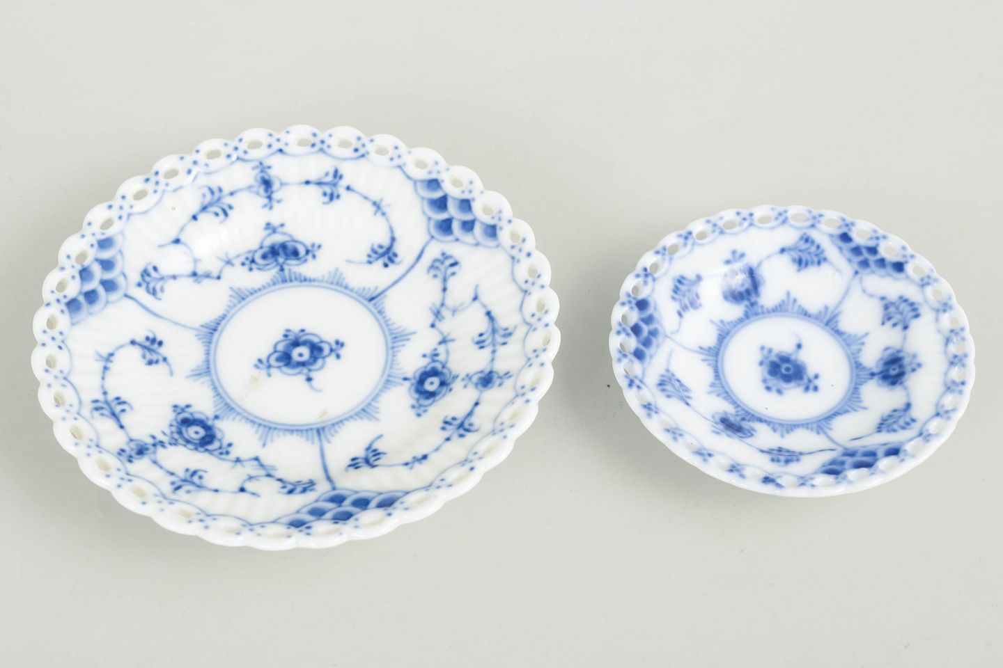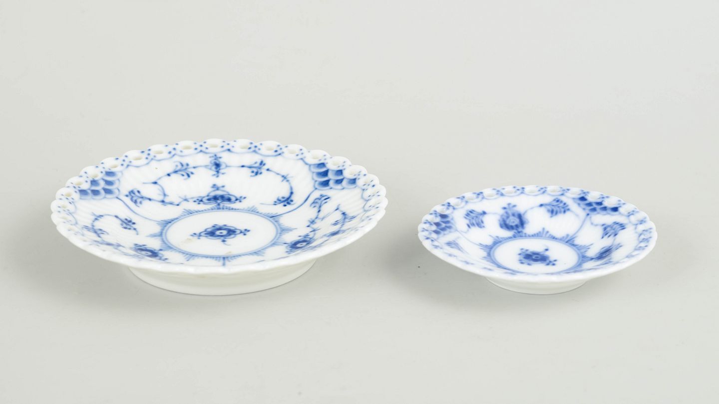 Royal Copenhagen, Musselmalet helblonde små fade, sæt på 2.To små fade i håndmalet underglasurblå dekoration i Musselmalet helblonde, med gennembrudt blondedekoration langs kanten. Modeller 1/1145 og 1/1004. Det ene fad dateret 1969–1974, det andet dateret 1961. Ét fad i 1. sortering og ét fad annulleret med to indridsede streger.