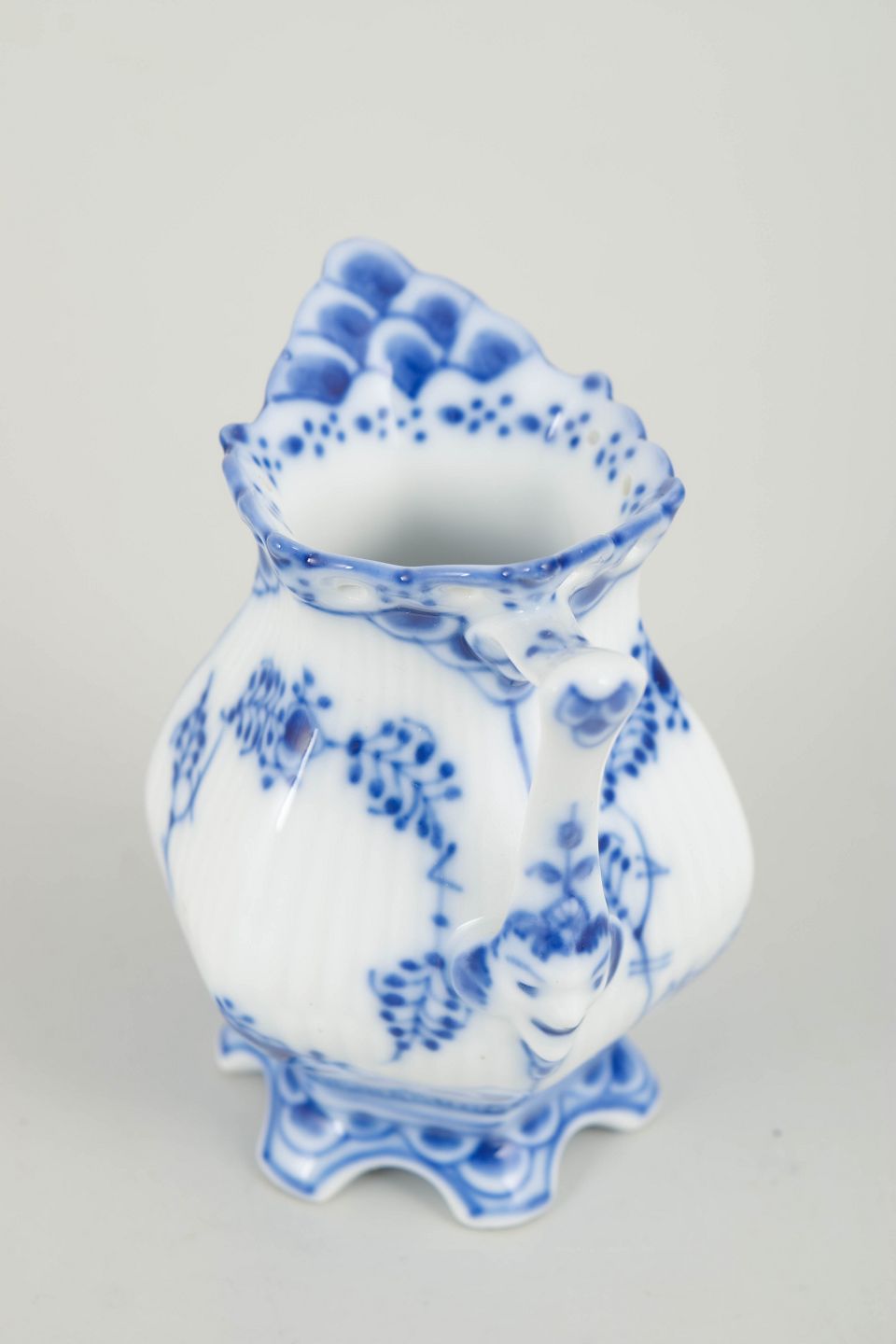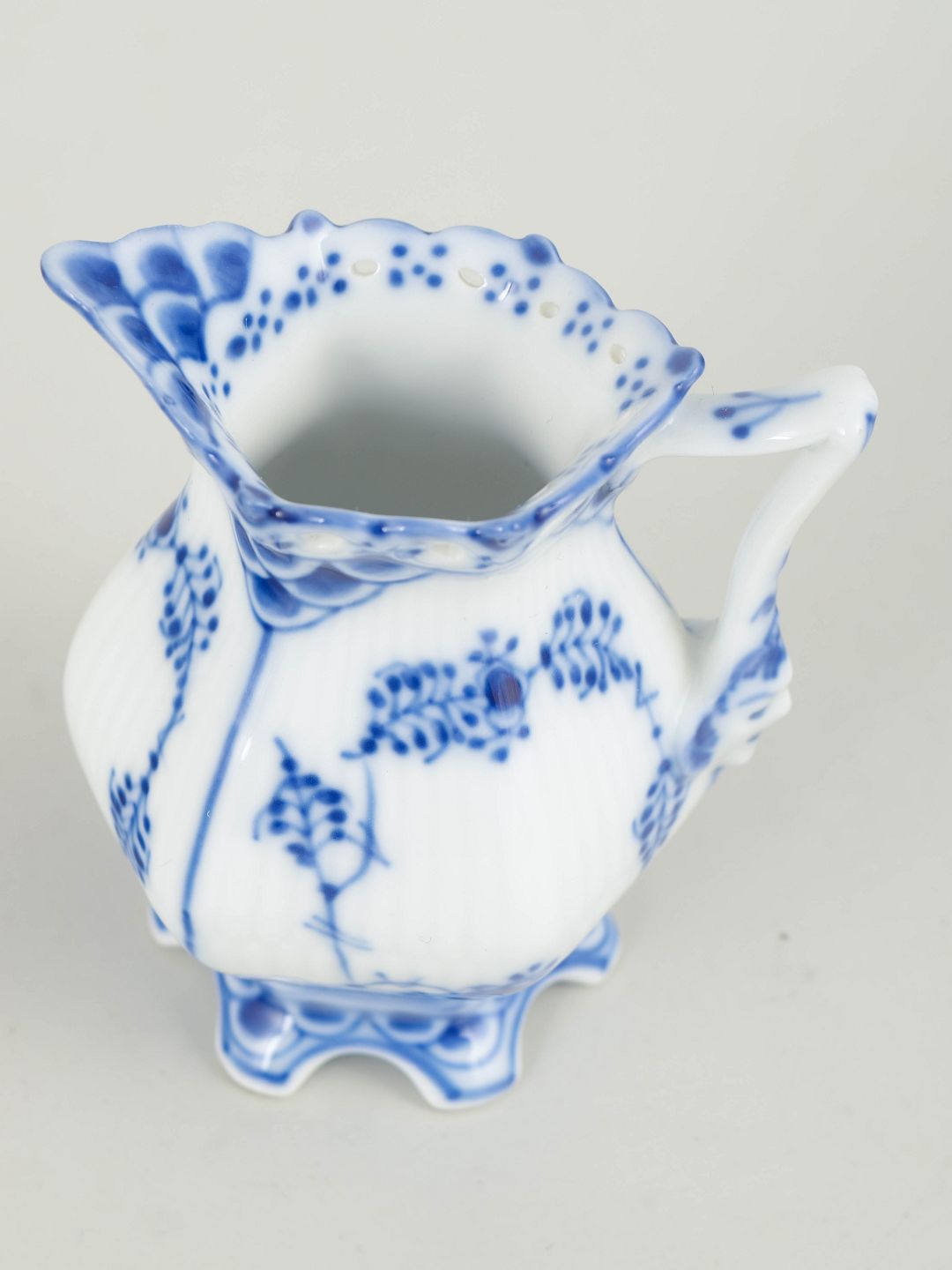 Royal Copenhagen, Musselmalet helblonde flødekande.Flødekande i håndmalet underglasurblå dekoration i det klassiske Musselmalet helblonde-stel, med gennembrudt blondedekoration langs kant og fod. Model 1/1031, 1. sortering.