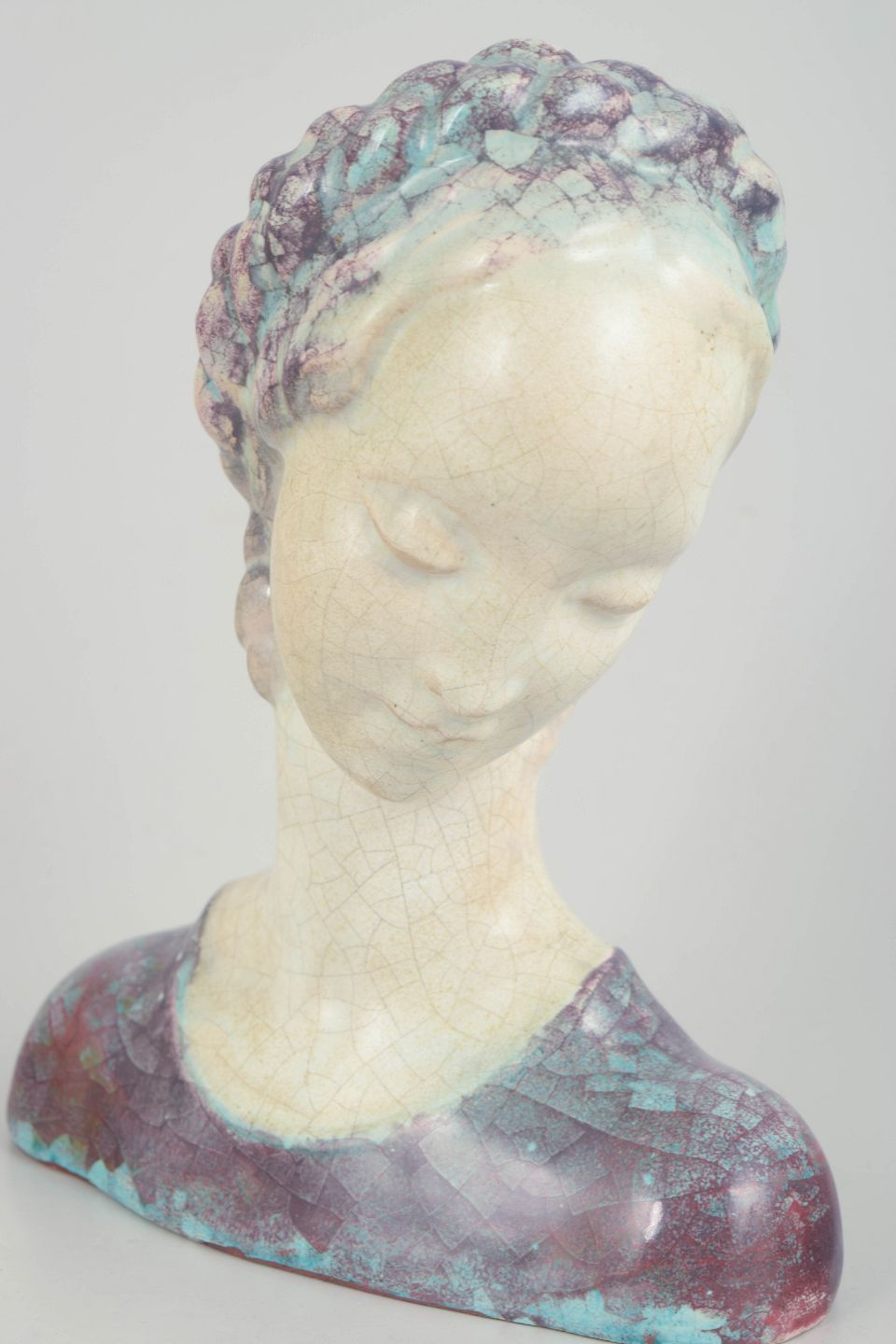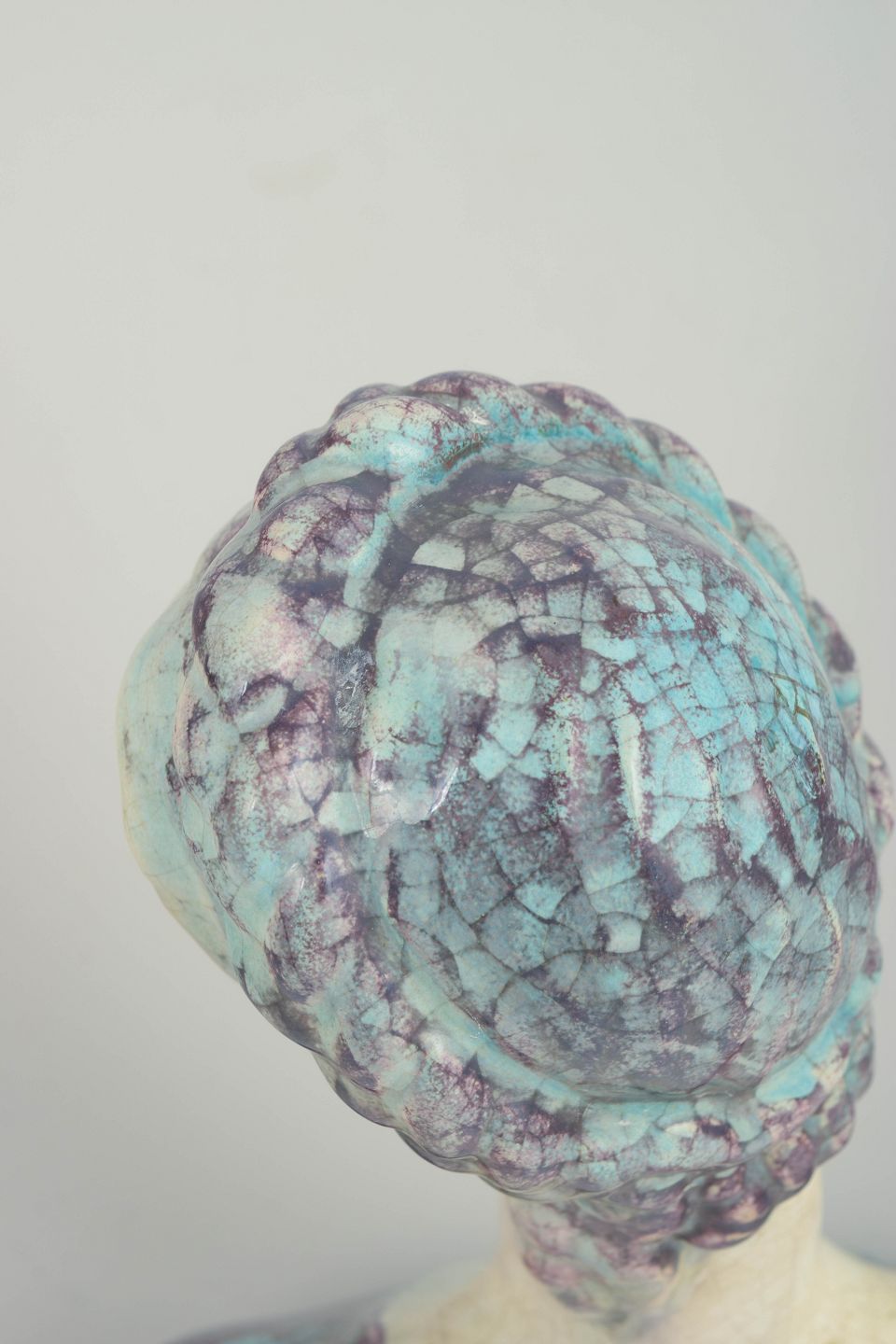 Michael Andersen, keramisk buste.Elegant kvindebuste i stentøj udført i Art Deco-inspireret stil med stiliseret hår og let nedadbøjet hoved. Glaseret i dæmpede, krakelerede nuancer af creme, violet og turkis. Fremstillet på Bornholm og stemplet under bunden med værkets ovale M.A.&S.-mærke.