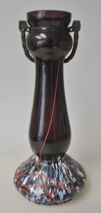 Jugendvase, ca. 1900, Deutschland. Violettes Glas mit Sockel aus weißem, blauem und grauem Glas. Oberhalb roten Glaslinie. Oben mit Bronzedekor montiert. H.: 25,2 cm.