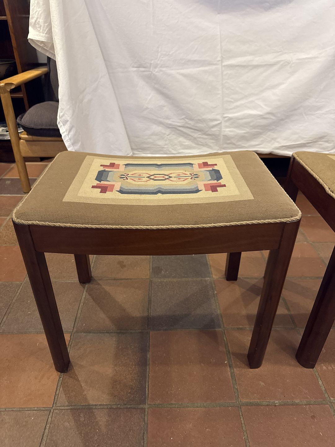 Dansk snedker et par taburetter i lakeret mahogni betrukket med stof. Fremstår i pæn brugt stand, betræk med brugsspor.