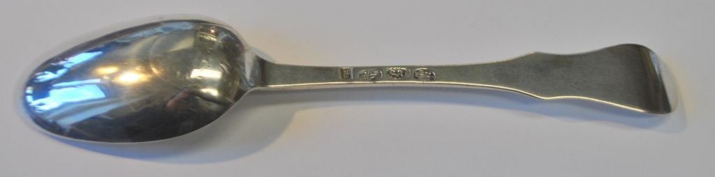 Andreas Røymand (1745–1791), Kopenhagen, Dänemark: Barocklöffel aus Silber. 1780. Gestempelt mit Meistermarke, Stadtmarke usw. Länge: 20,4 cm. Gewicht: 57 Gramm.Mit zahlreichen späteren Gravuren.
