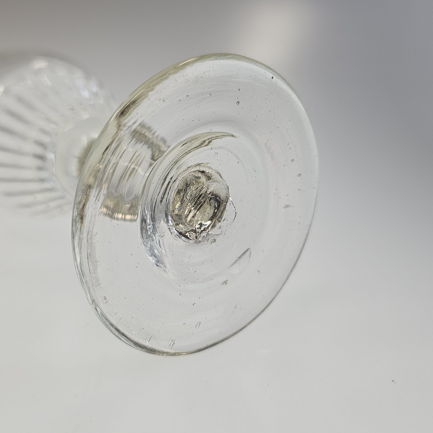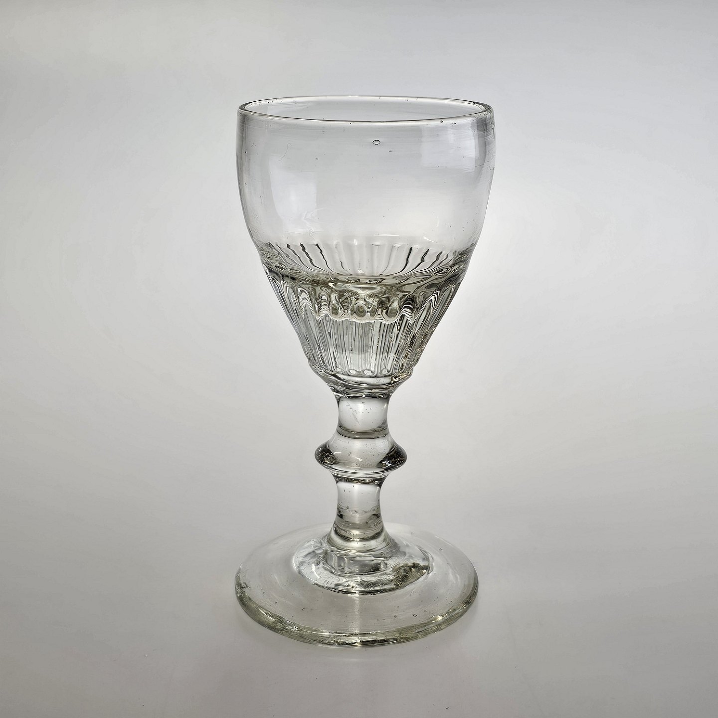 Håndblæst vinglas med riflet, tøndeformet kumme på stilk med knapProducent Conradsminde ca. 1840