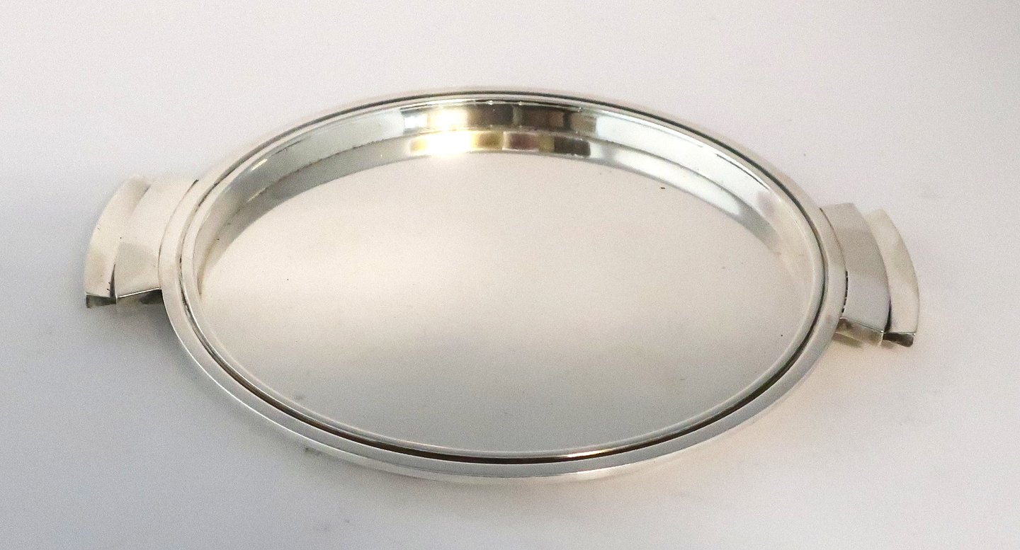 Georg Jensen. Pyramide. Harald Nielsen. Sterlingsilber. Senfglas, Salzstreuer und Pfefferstreuer auf kleinem Tablett. Entwurf 632 Händler