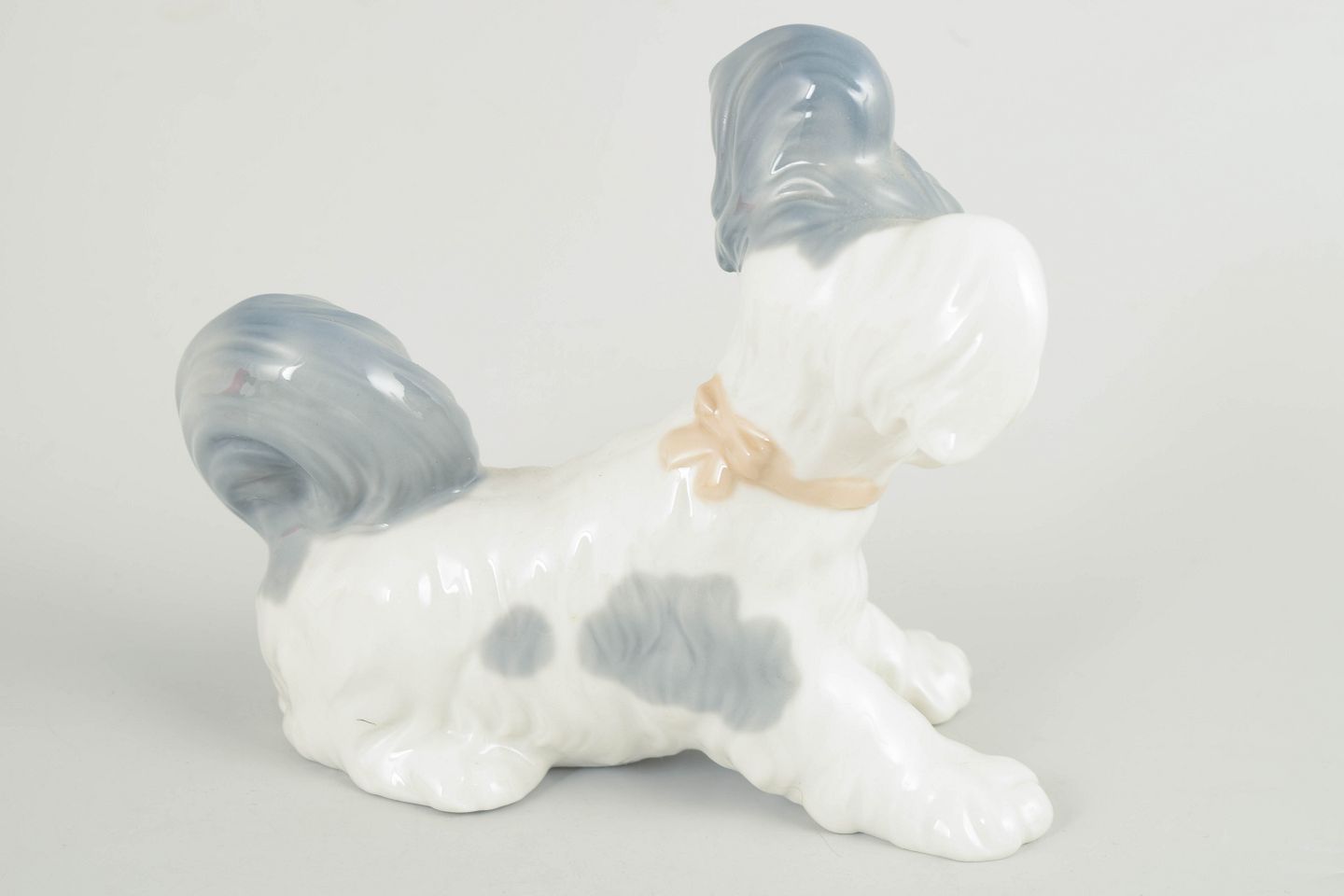 Lladró, Spanien, hundefigur.Naturalistisk porcelænsfigur forestillende en lille hund i siddende stilling, modelleret i hvid glasur med grå og lyseblå detaljer. Glat, blank overflade og bløde, afrundede former, typisk for Lladrós figurative produktion fra perioden.