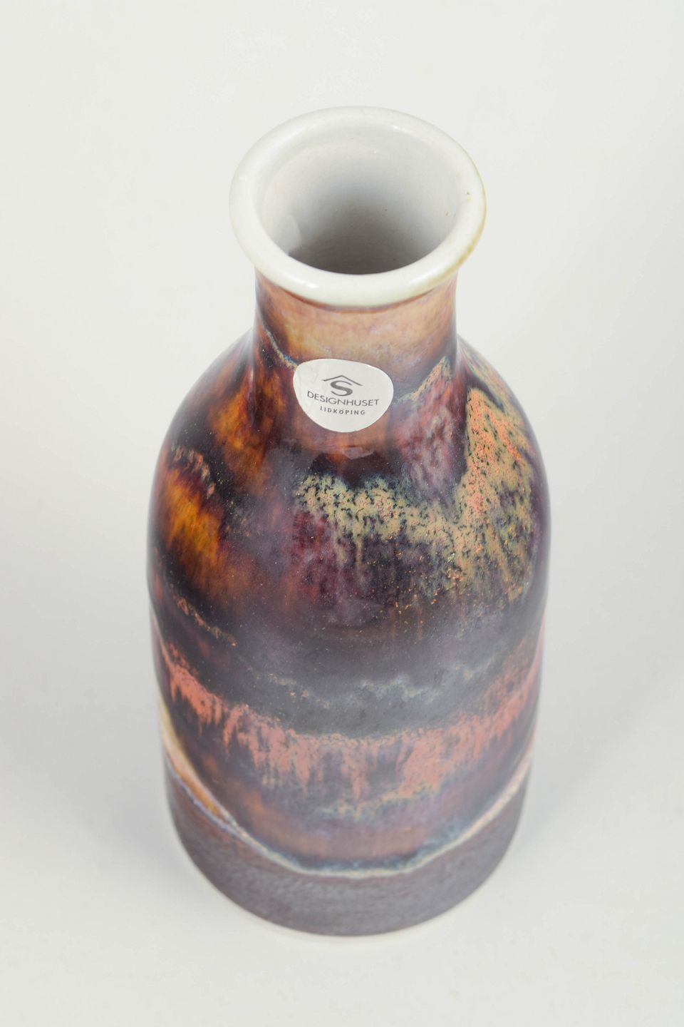 Carl-Harry Stålhane for Designhuset Linköping, unik vase.Slank, balusterformet vase i stentøj med levende, flerfarvet glasur i dybe brune, blålige og okkergule nuancer, afsluttet med lys kant ved mundingen.