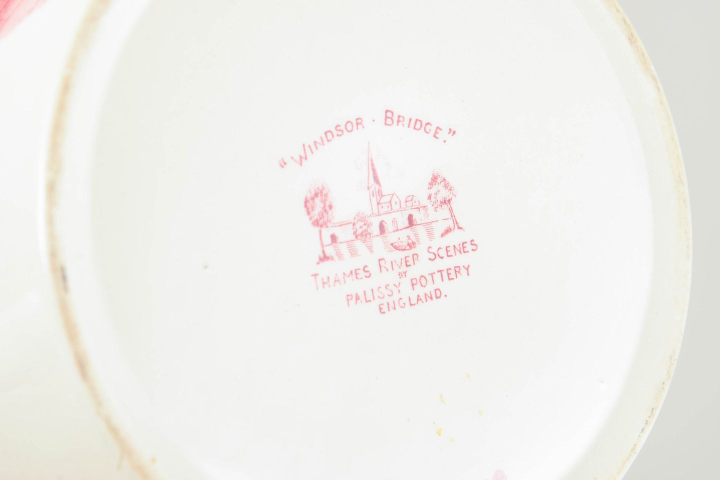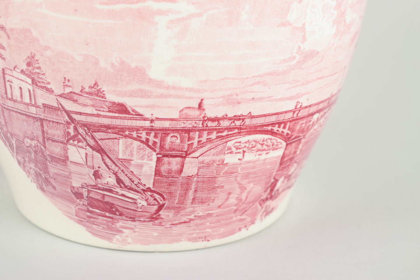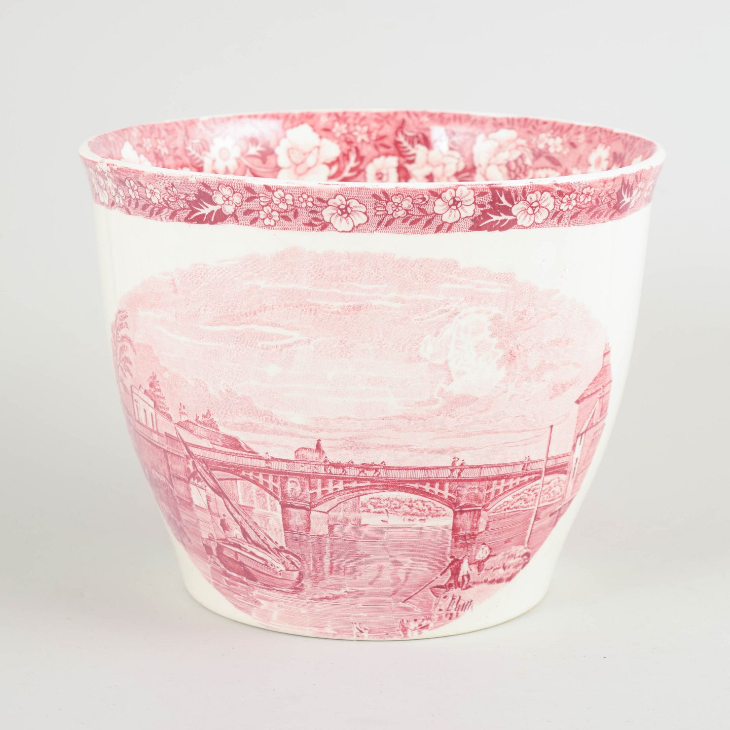 Palissy Pottery, urtepotteskjuler.Urtepotteskjuler i fajance fra Palissy Pottery, dekoreret i rød transferware med motiv fra Themsen og ornamental bort.