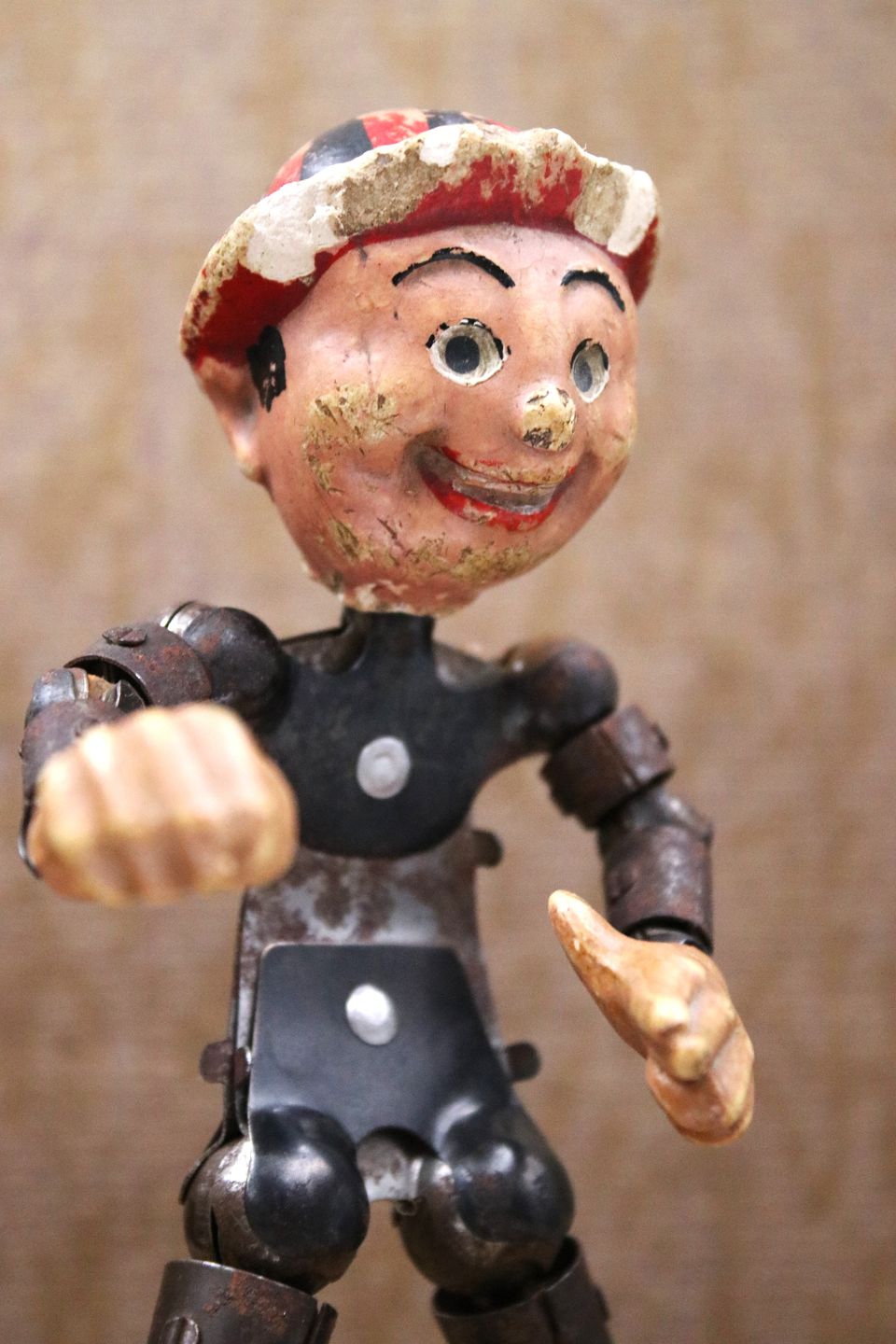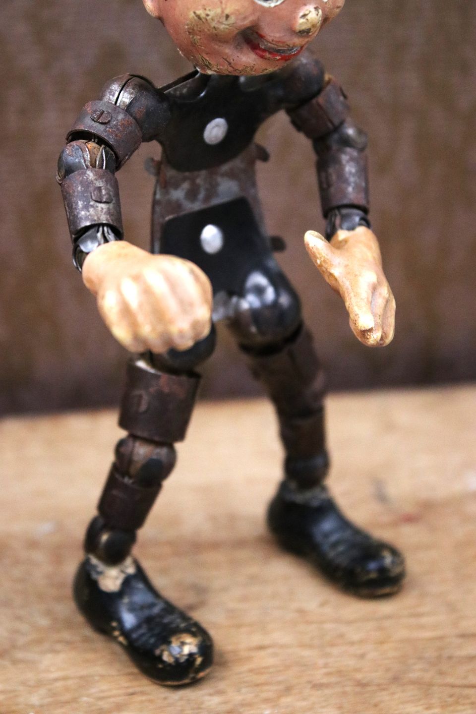Sjov , gammel figur i metal og gips af lille mand.Krop , arme og ben er i metal som kan bøjes , hoved og hænder er i bemalet gips ( har lidt afslag ) Højde: 16,5cm.