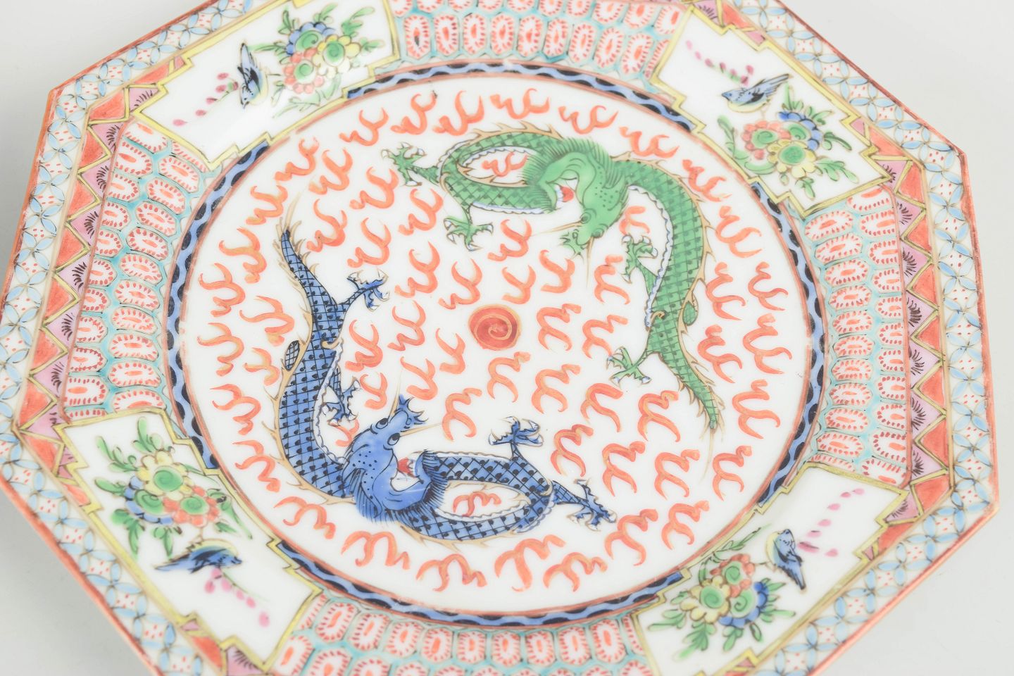 Kinesisk porcelænsproducent, sæt af 2 ottekantede tallerkener.Ottekantede tallerkener i håndmalet porcelæn med polykrom dekoration af drager og stiliserede mønstre i jernrøde, grønne og blå toner, indrammet af geometriske og florale borter. Udført til eksportmarkedet.