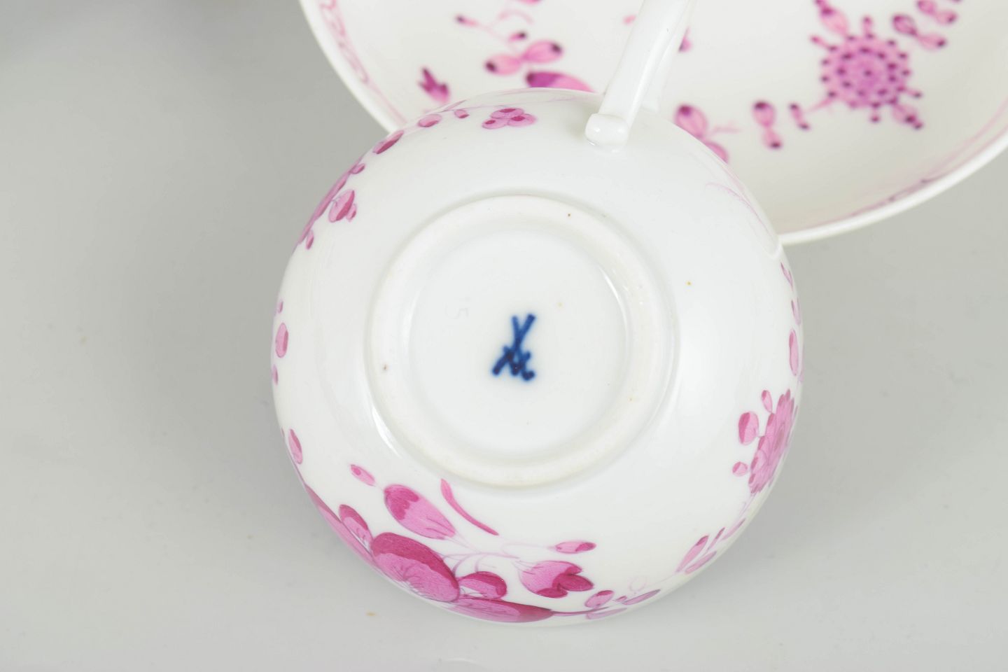 Antikke små kaffekopper i porcelæn med håndmalet dekoration i rosa toner. Klassisk Meissen-udtryk med fine blomster- og båndmotiver.