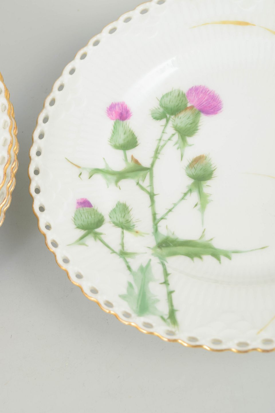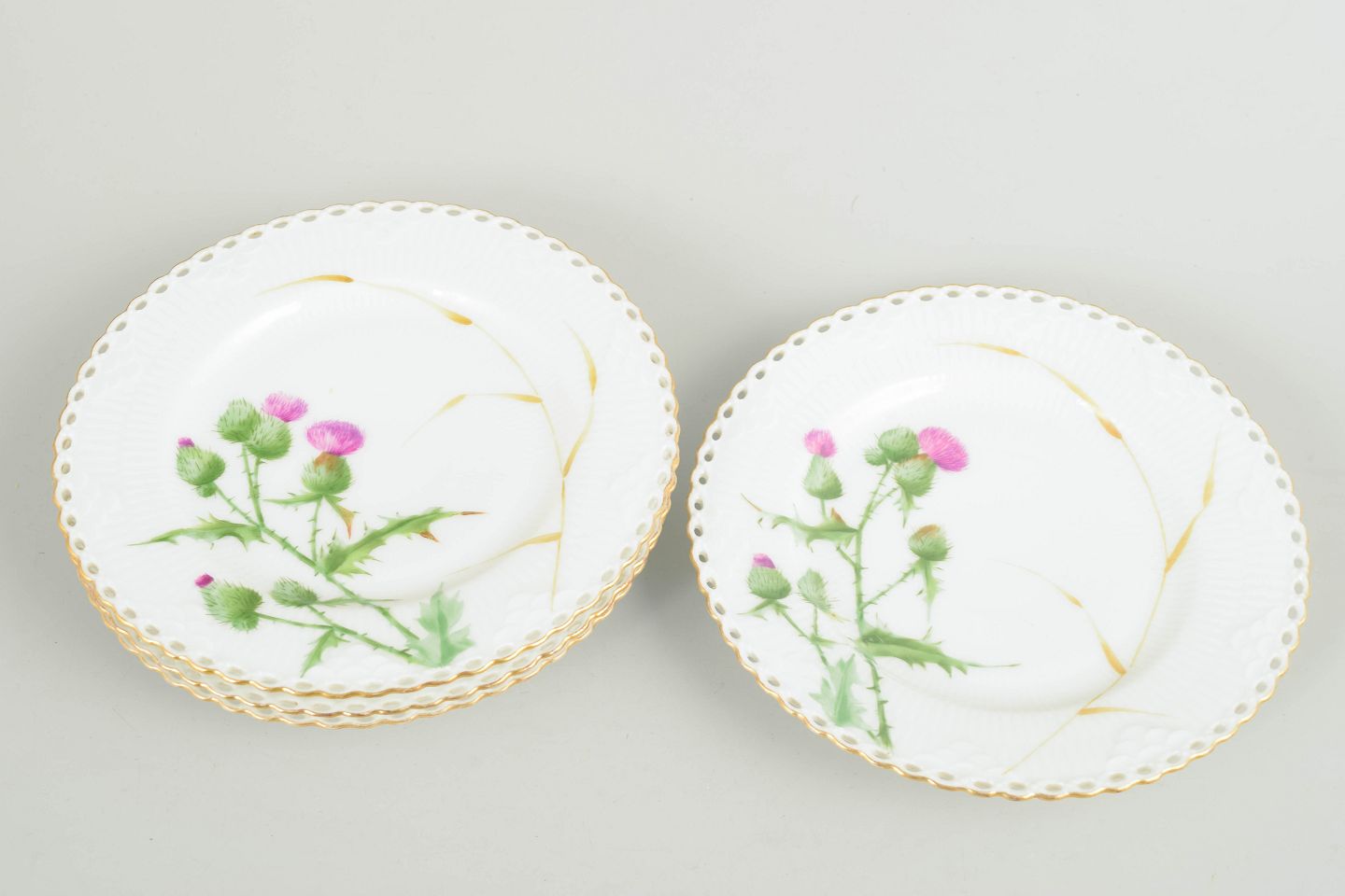 Royal Copenhagen, sæt på 4 antikke tallerkener, tidsel.Håndmalede porcelænstallerkener med gennembrudt rand og naturalistisk dekoration med tidselmotiv. Udført med fine farvenuancer og diskrete forgyldninger, karakteristisk for Royal Copenhagens produktion i det 19. århundrede.
