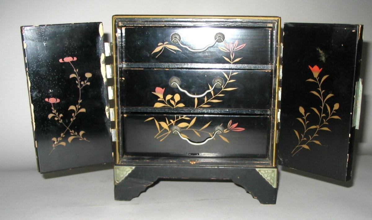Chinesische Schmuckschatulle aus Lackarbeit mit Vogelmotiven auf beerenbehangenen Zweigen. Zwei Türen, innen drei Schubladen – ebenfalls verziert. Höhe: 21 cm, Tiefe: 11 cm, Breite: 19 cm. Leichte Gebrauchsspuren.Bestellnummer: 1504