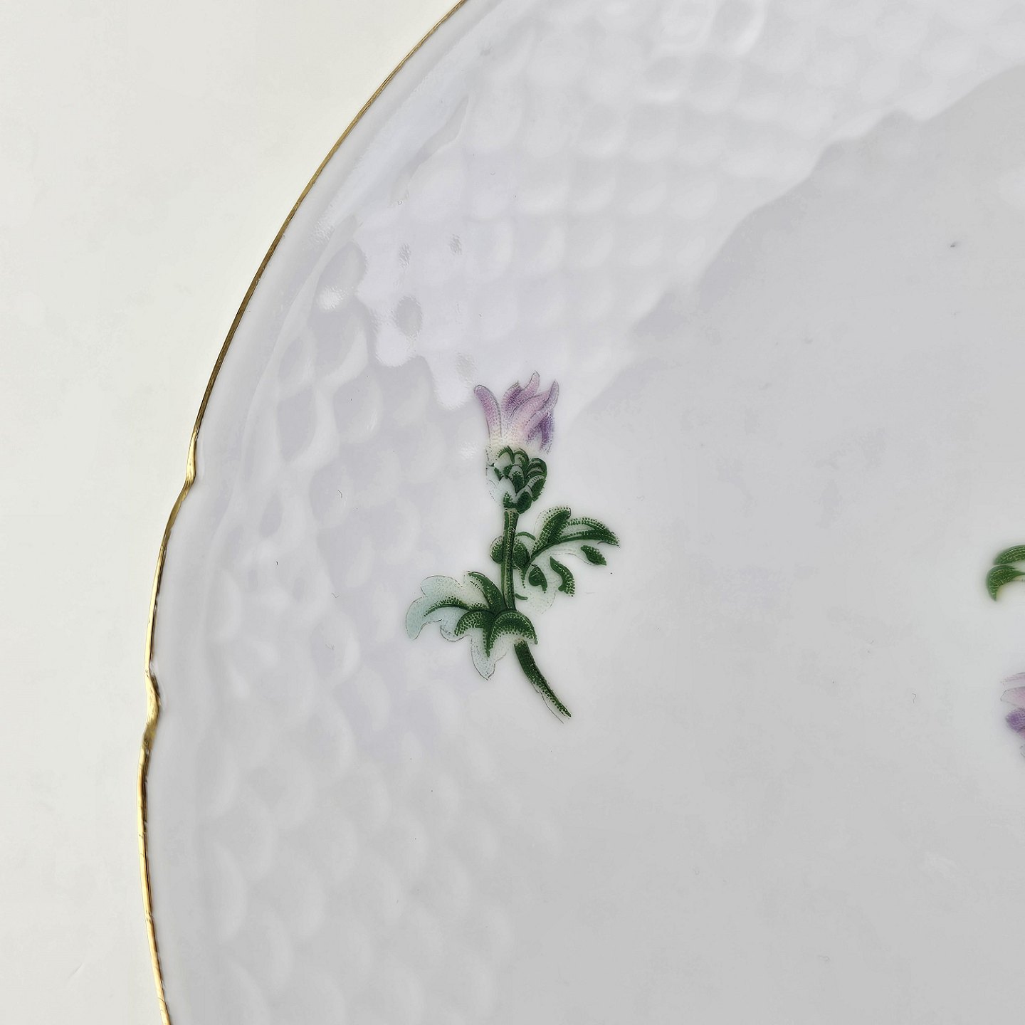 Krysantemum er hvidt porcelæn dekoreret med lys lilla blomst, grønne blade og guldkant.