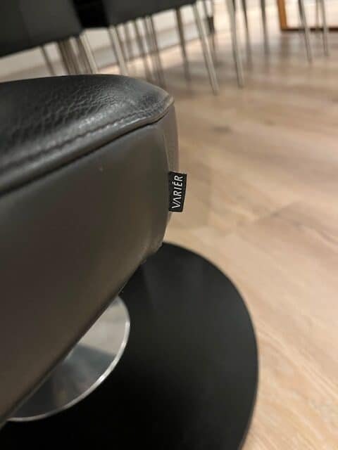 Exklusiver VARIER Peel Club Lounge-Sessel. VARIER Peel Club Lounge-Sessel aus schwarzem Anilinleder, Preisgruppe 6, mit einem Gestell aus schwarz lackiertem Eschenholz. Neupreis: 21.999 DKK. Der Peel Club Sessel wurde von der renommierten norwegischen Marke Varier entworfen und ist eine kompaktere Version des Varier Peel Lounge-Sessels. Das Modell vereint elegantes Design mit hoher Funktionalität und Komfort. Dieser Sessel verfügt über eine Öffnung nach rechts und ein Gestell aus schwarz lackiertem Eschenholz. Er stammt aus einem Nichtraucherhaushalt ohne Haustiere und wurde ausschließlich als Dekorationsobjekt genutzt, weshalb er sich in einem sehr guten Zustand befindet. Peel Club ist bekannt für sein aktives Sitzkonzept, das optimale Unterstützung und vielfältige Sitzpositionen ermöglicht und so für Komfort und Abwechslung sorgt. Maße: Höhe: 78 cm, Breite: 82 cm, Tiefe: 77 cm, Sitzhöhe: 42 cm Händler