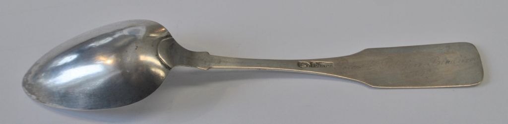 Thomas Jensen II (1797–1853), Aabenraa, Dänemark: Empire-Speiselöffel aus Silber. Gestempelt mit Meister- und Stadtmarke. Länge: 22,5 cm. Mit Gravur: Peter J. Petersen, Blaakrog 1840