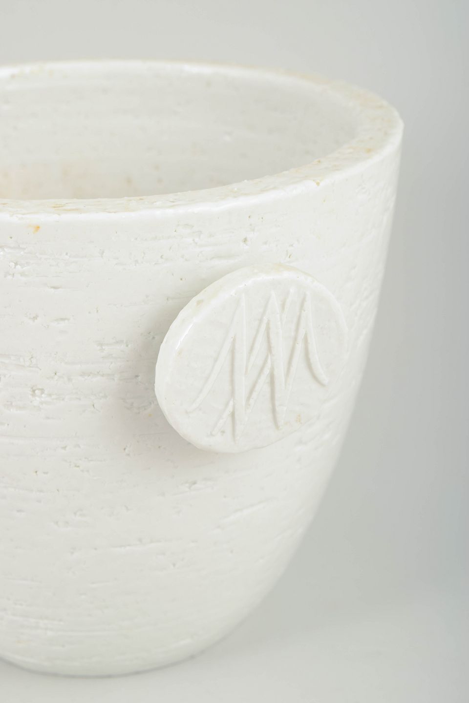 Gunnar Nylund for Rörstrand, stor champagnekøler.Stor cylindrisk champagnekøler/isspand i hvidglaseret stentøj med let konisk korpus og to markante sidehanke. Overfladen fremstår med diskret struktur og mat hvid glasur. Stemplet i bunden.