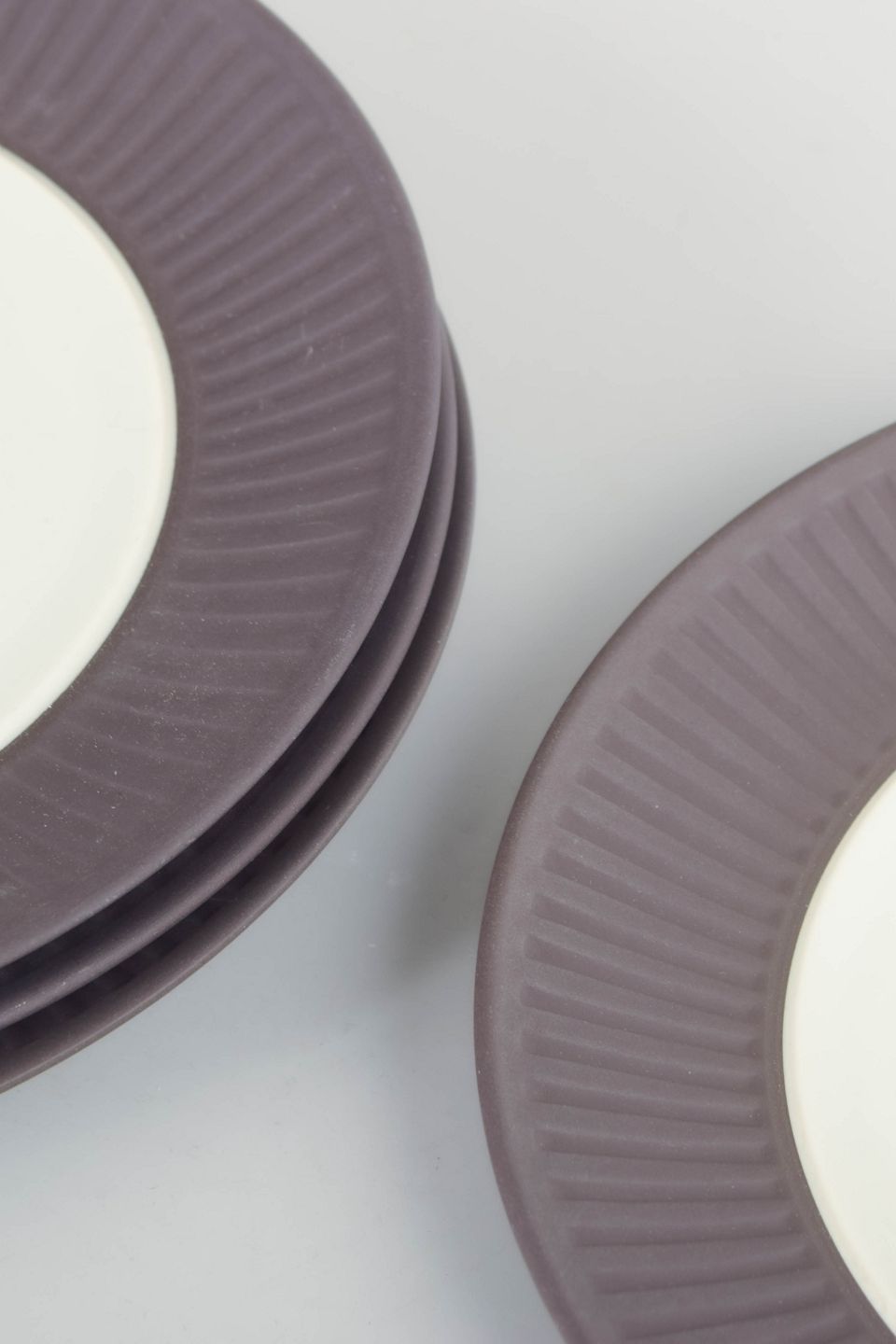Jens Harald Quistgaard for Dansk Designs, sæt på 4 tallerkener.Sæt bestående af fire tallerkener i stentøj med hvid glasur og rillet fane samt lys glasur i spejlet.