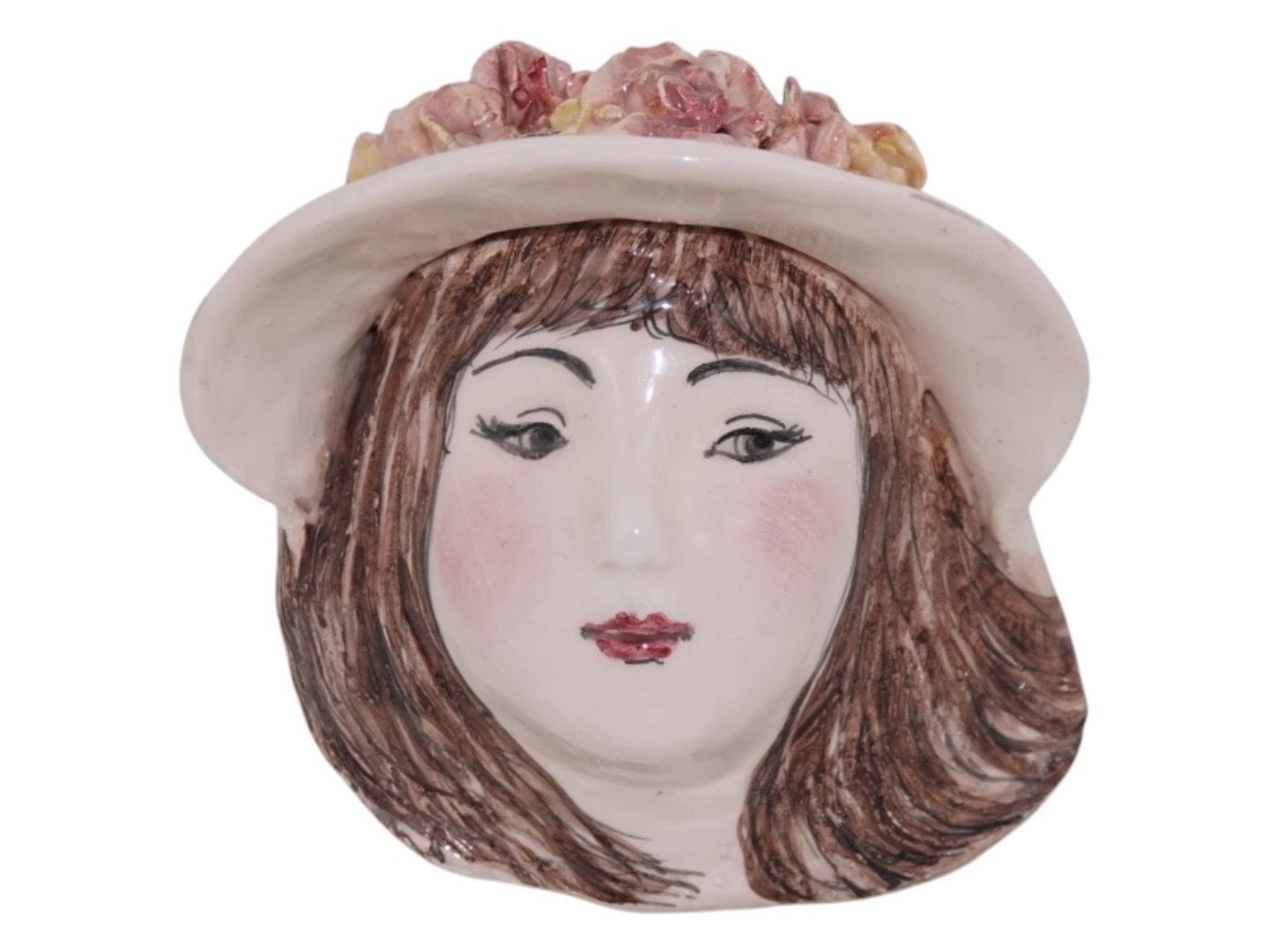 Doreen Middelboe keramik, væghængt figur af dame med blomsterhat.