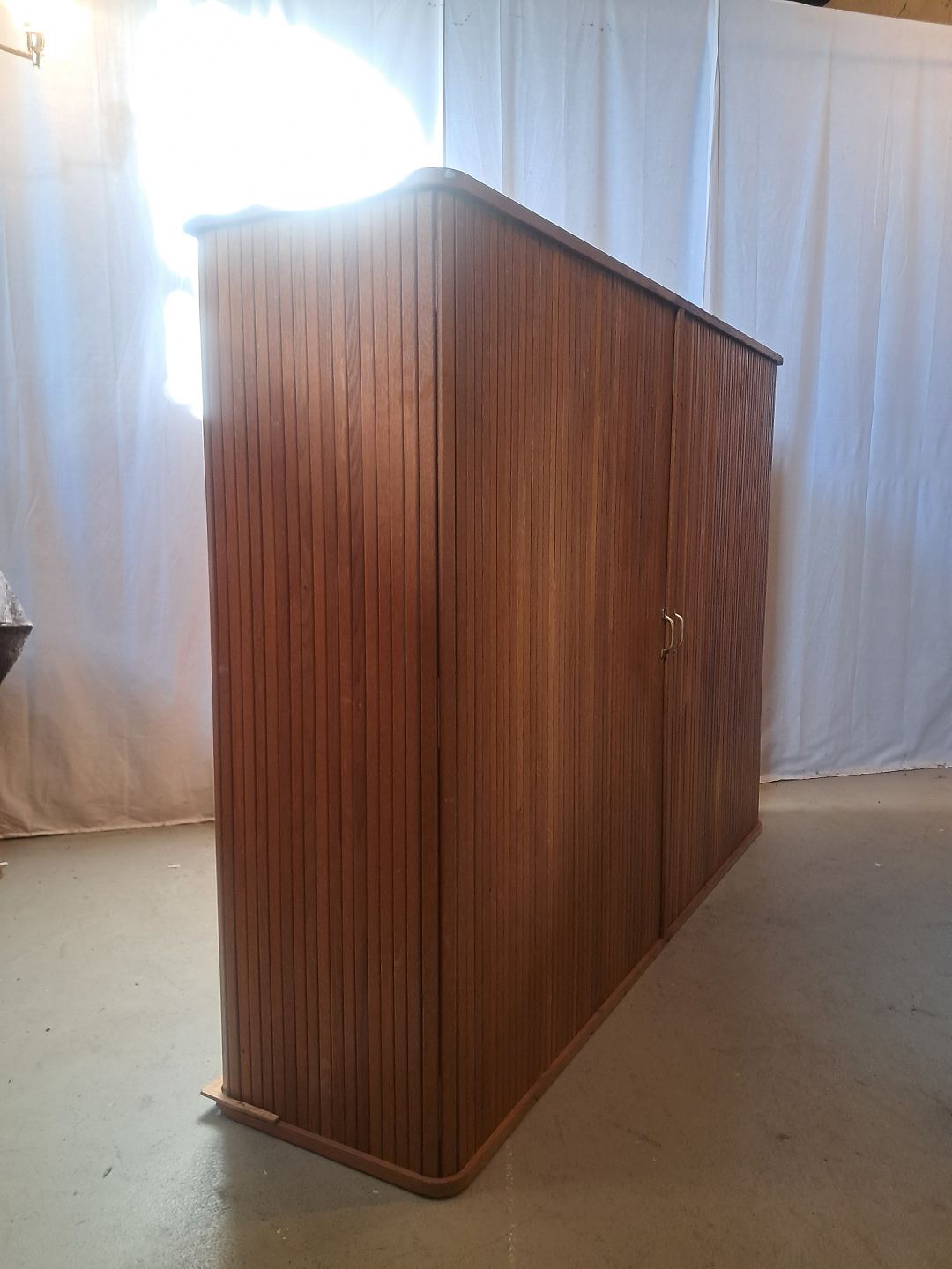 Jalousiskab i fineret egetræ, fra 1950erne.Det har brugsspor og defekter.