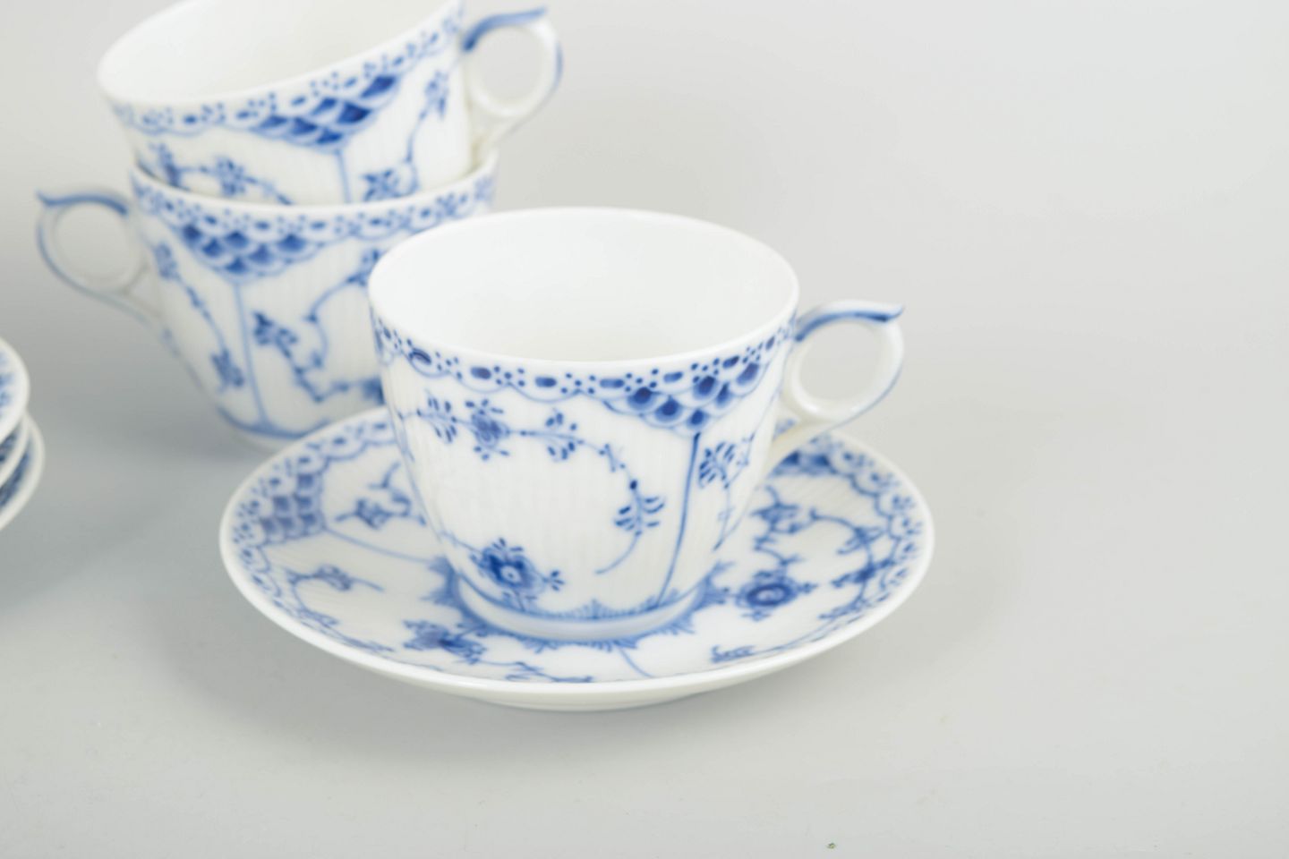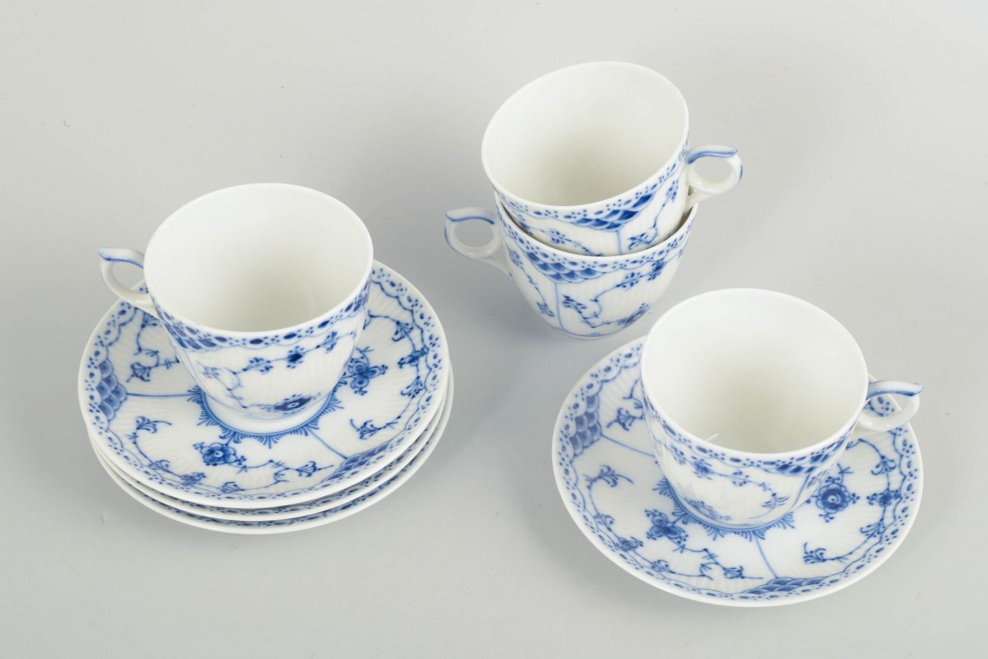 Royal Copenhagen Musselmalet Halvblonde, sæt af fire kaffekopper med tilhørende underkopper.