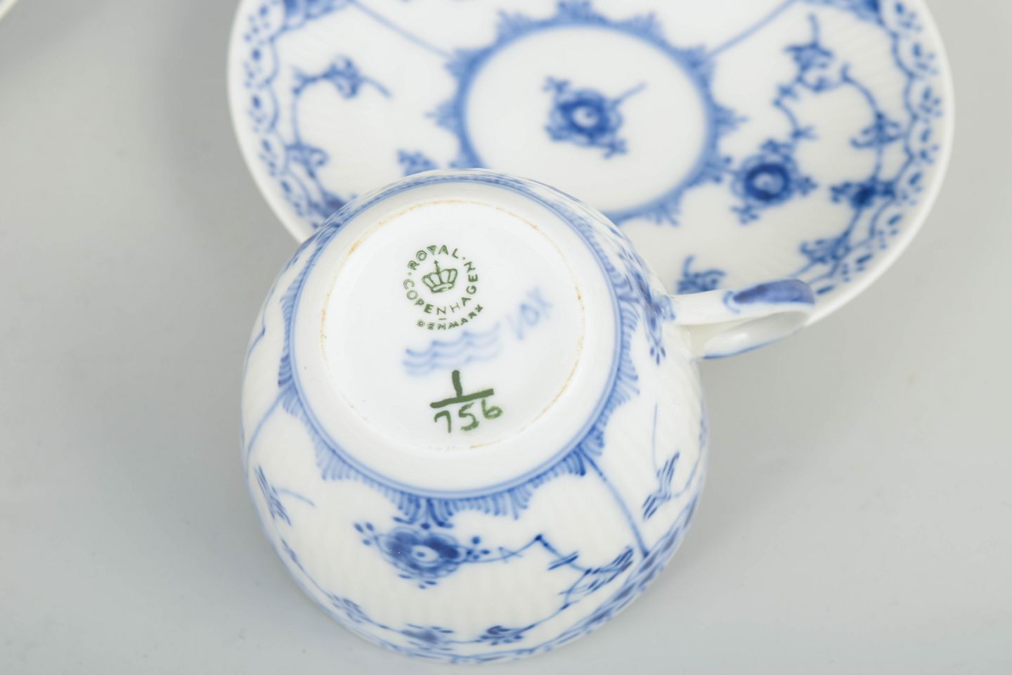 Royal Copenhagen blev grundlagt i 1775 i København under kongelig bevilling. Fabrikken er internationalt anerkendt for sit håndmalede porcelæn og sit høje kunstneriske niveau. Musselmalet Halvblonde er en variation af det klassiske Musselmalet stel og kombinerer riflede flader med en dekorativ blondekant, udført med stor håndværksmæssig præcision.