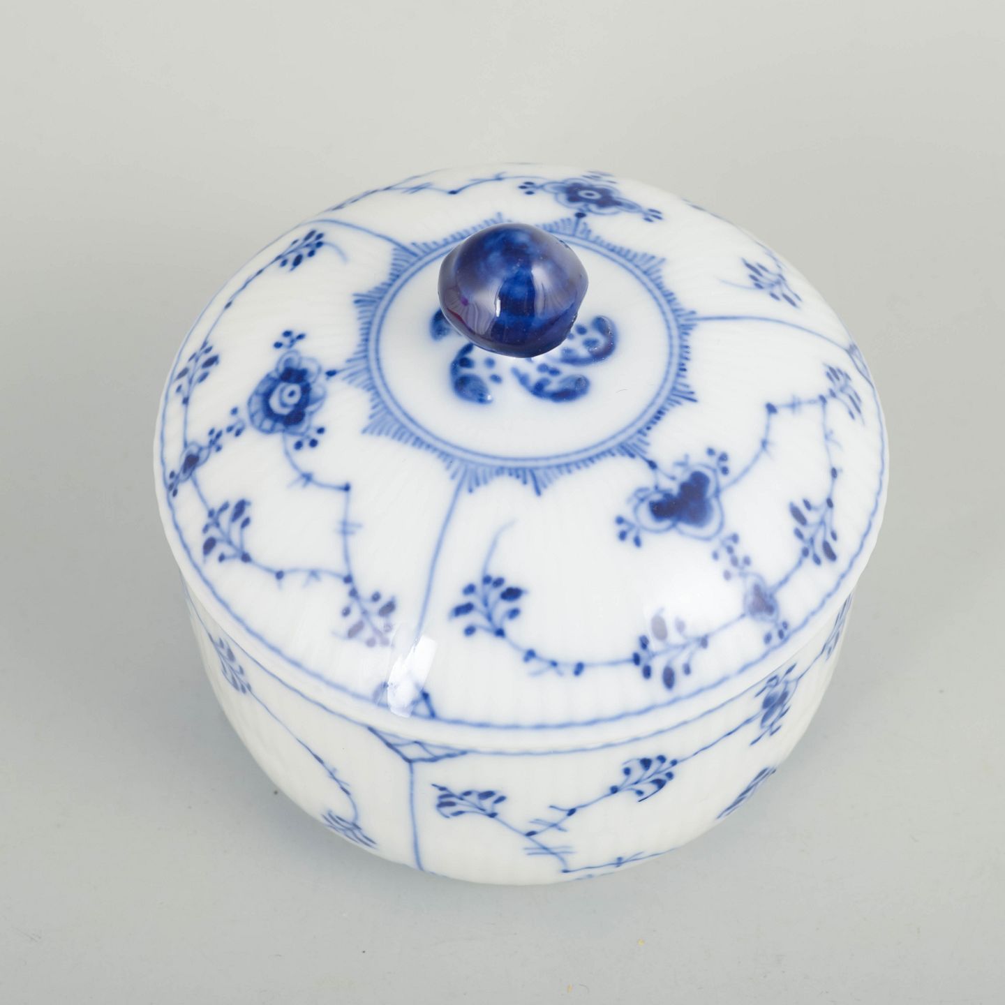 Lågskål i håndmalet porcelæn fra Musselmalet riflet med klassisk underglasurdekoration i koboltblå, riflede felter.