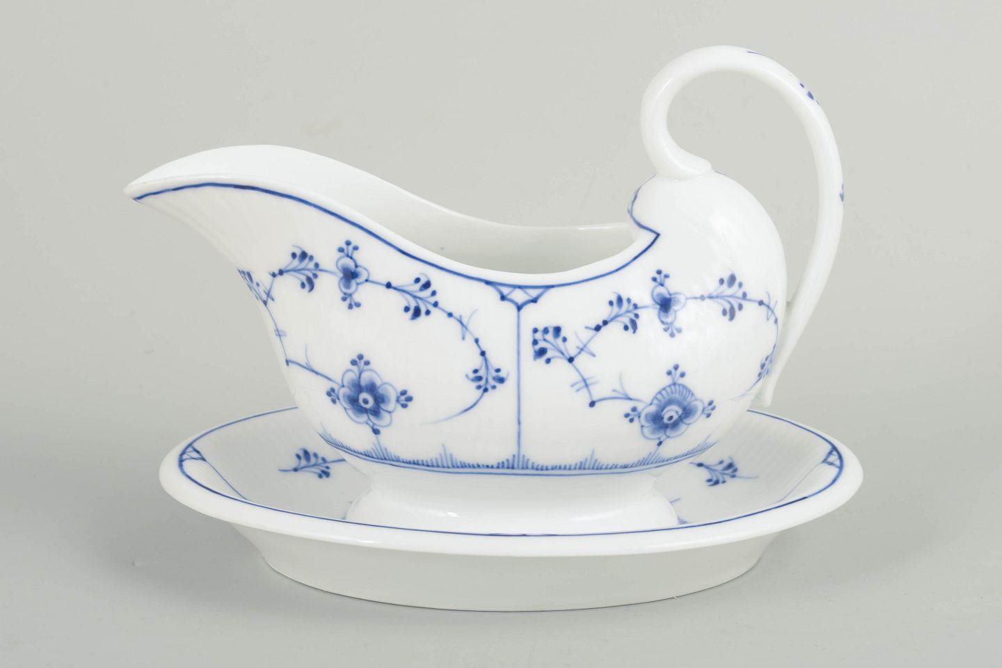 Royal Copenhagen Musselmalet Riflet, sjælden antik sauceskål.Sjælden antik sauceskål i håndmalet porcelæn fra Musselmalet Riflet med klassisk underglasurdekoration i koboltblå. Model 1/201. Med fast integreret underdel udført i ét stykke sammen med skålen. Første sortering. Fremstillet i 1890’erne.
