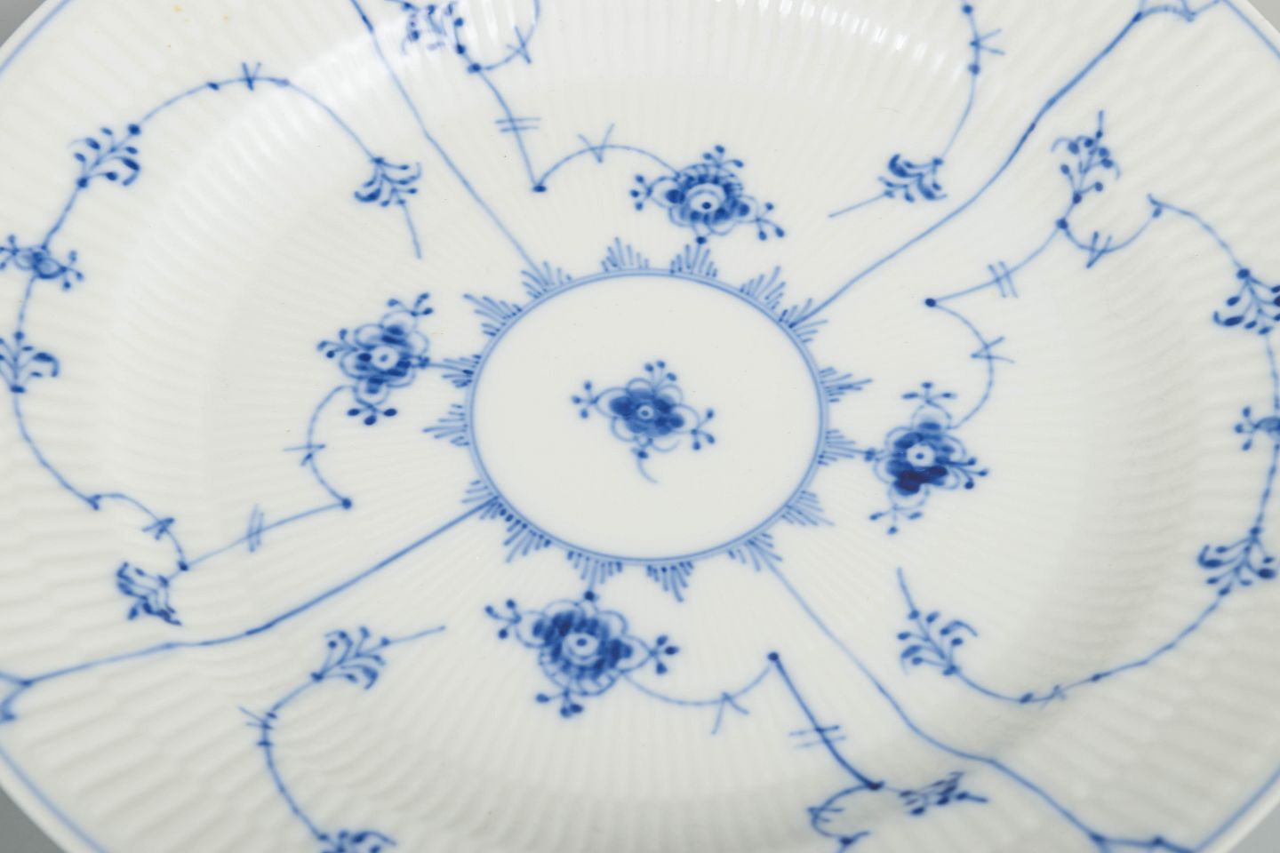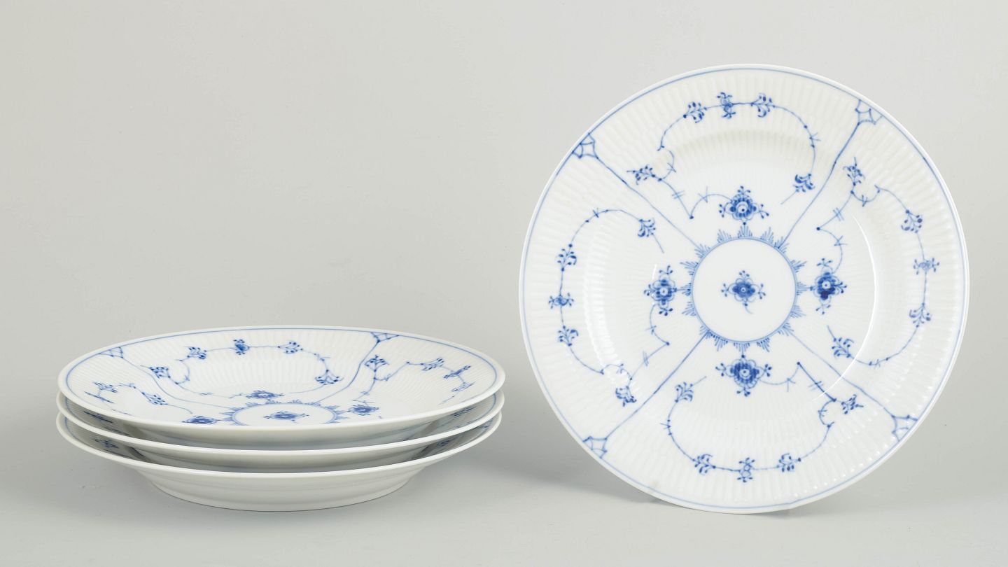Royal Copenhagen Musselmalet Riflet, sæt af fire middagstallerkener.