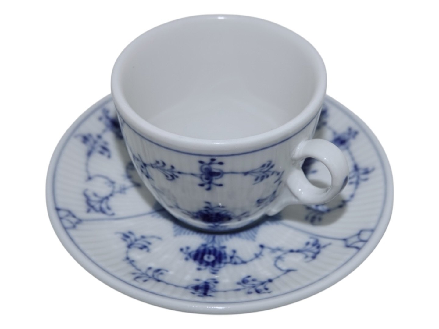 Royal Copenhagen Musselmalet Riflet Jernporcelæn (hotelporcelæn), kaffekop med tilhørende underkop.
