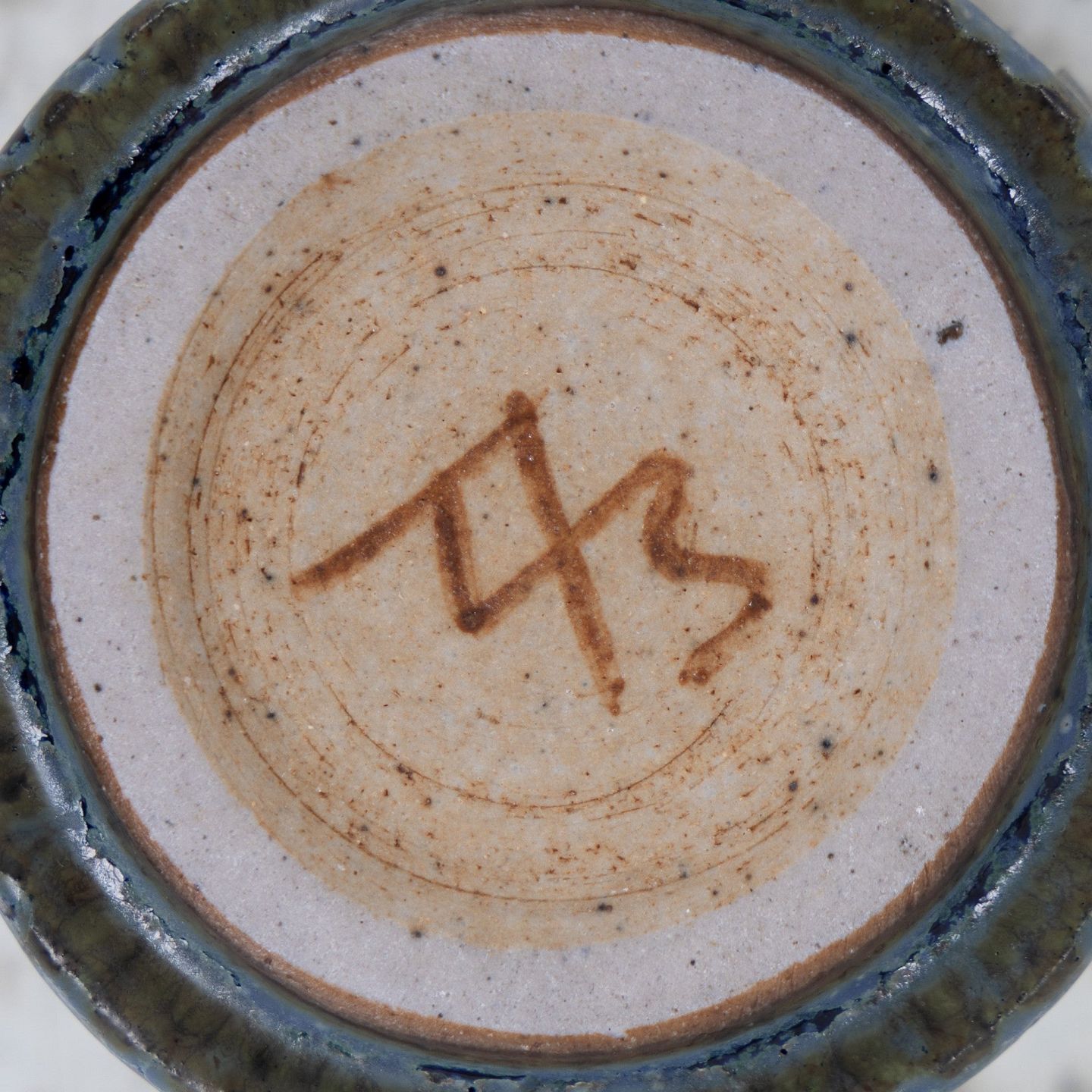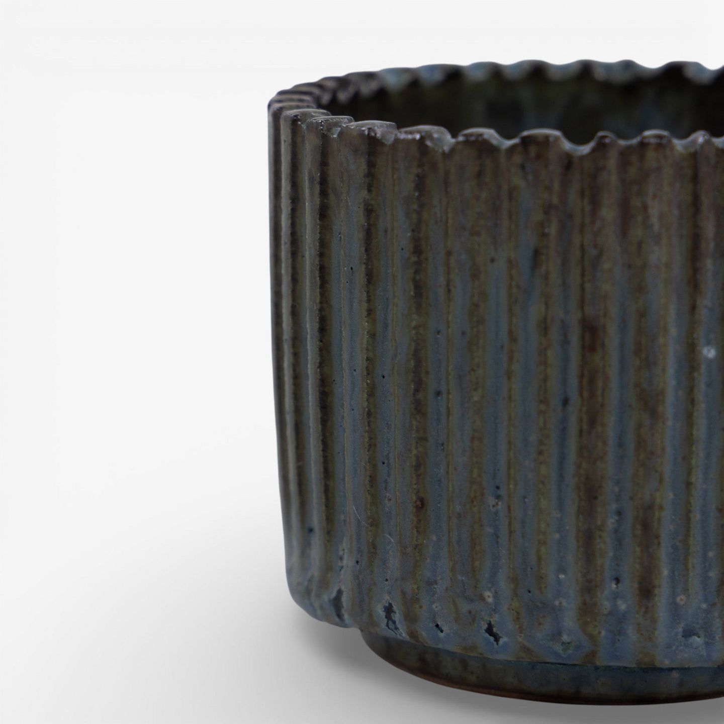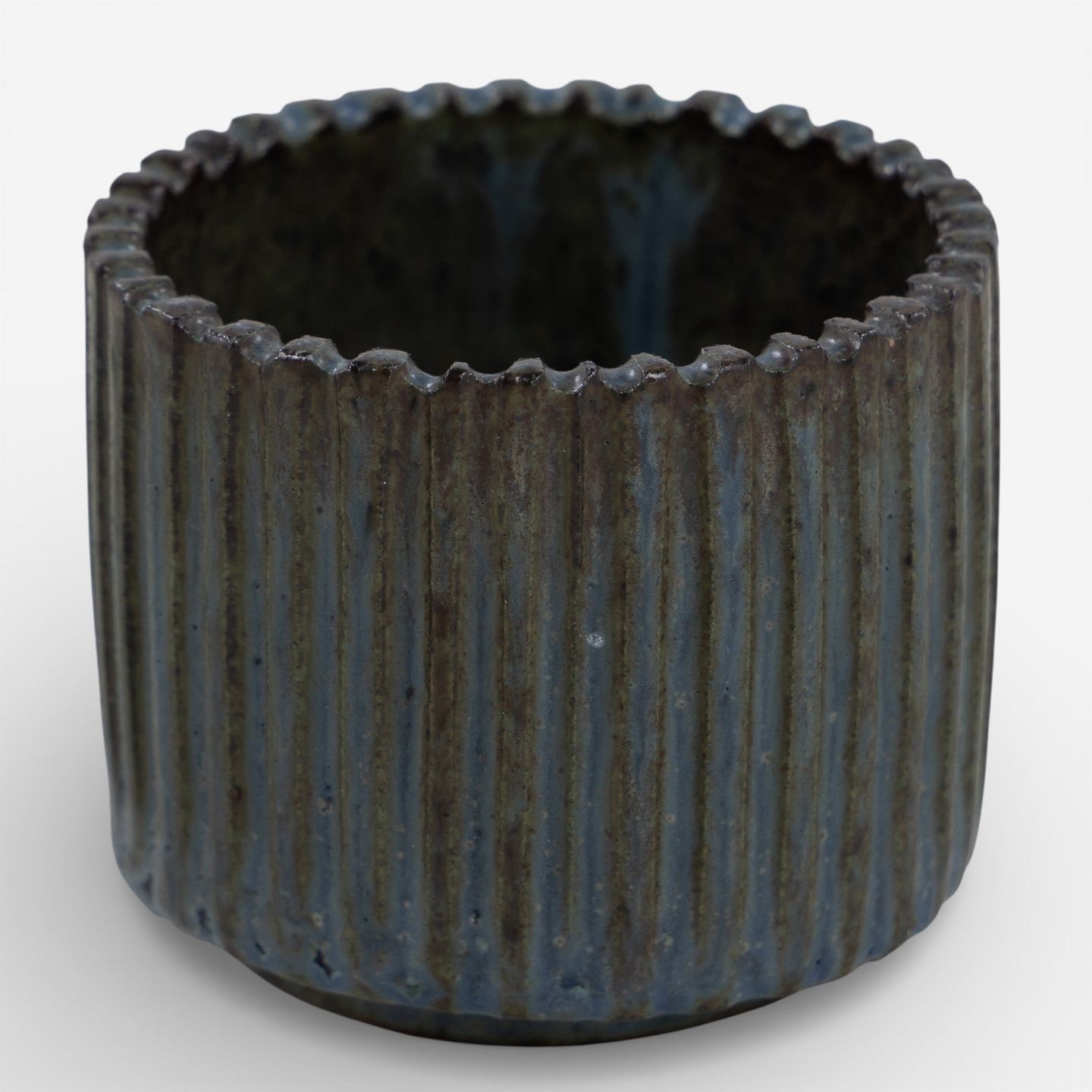 Arne Bang.Krukke i riflet stentøj med blågrøn glasur. Signeret.