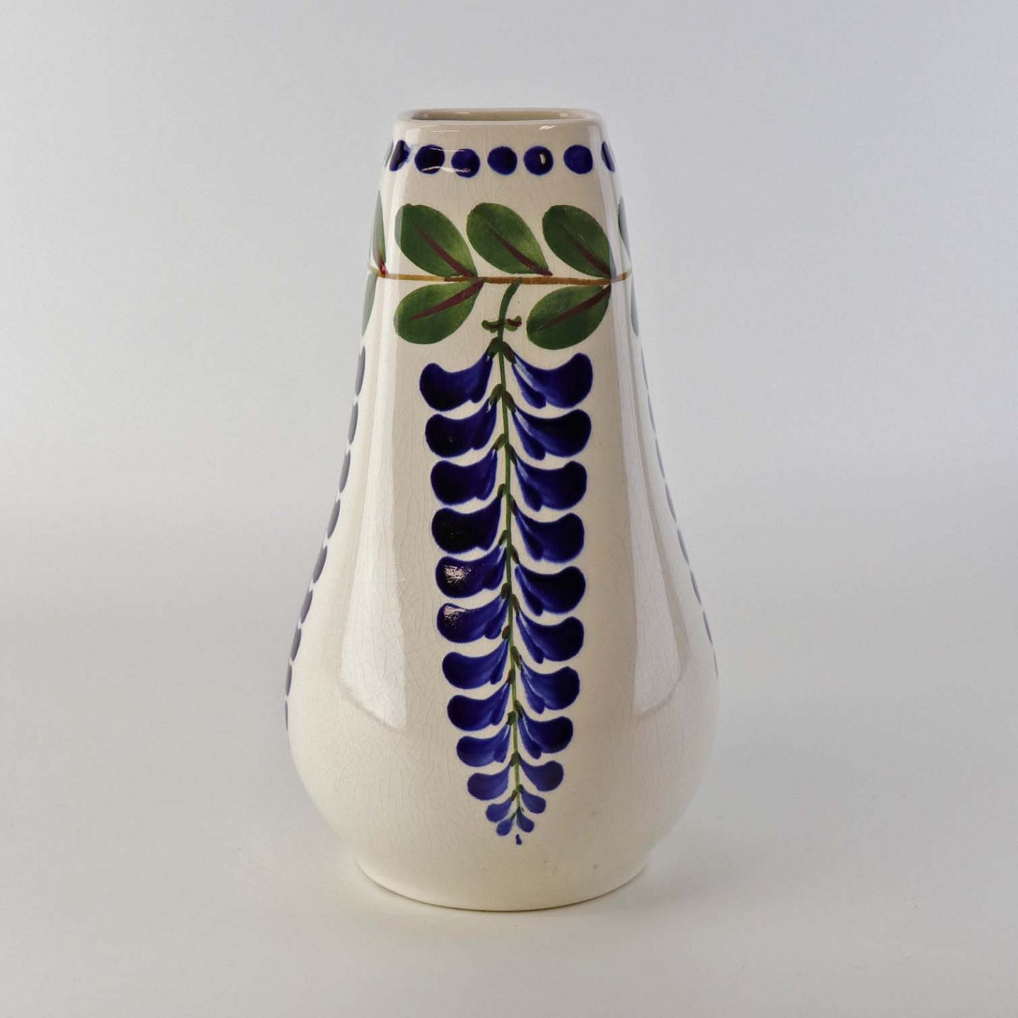 Høj vase i fajance med kantet hals fra stellet Blåregn. Stellet er fremstillet i perioden år 1903-1933. Nr. 522/110Formgiver Christian Joachim