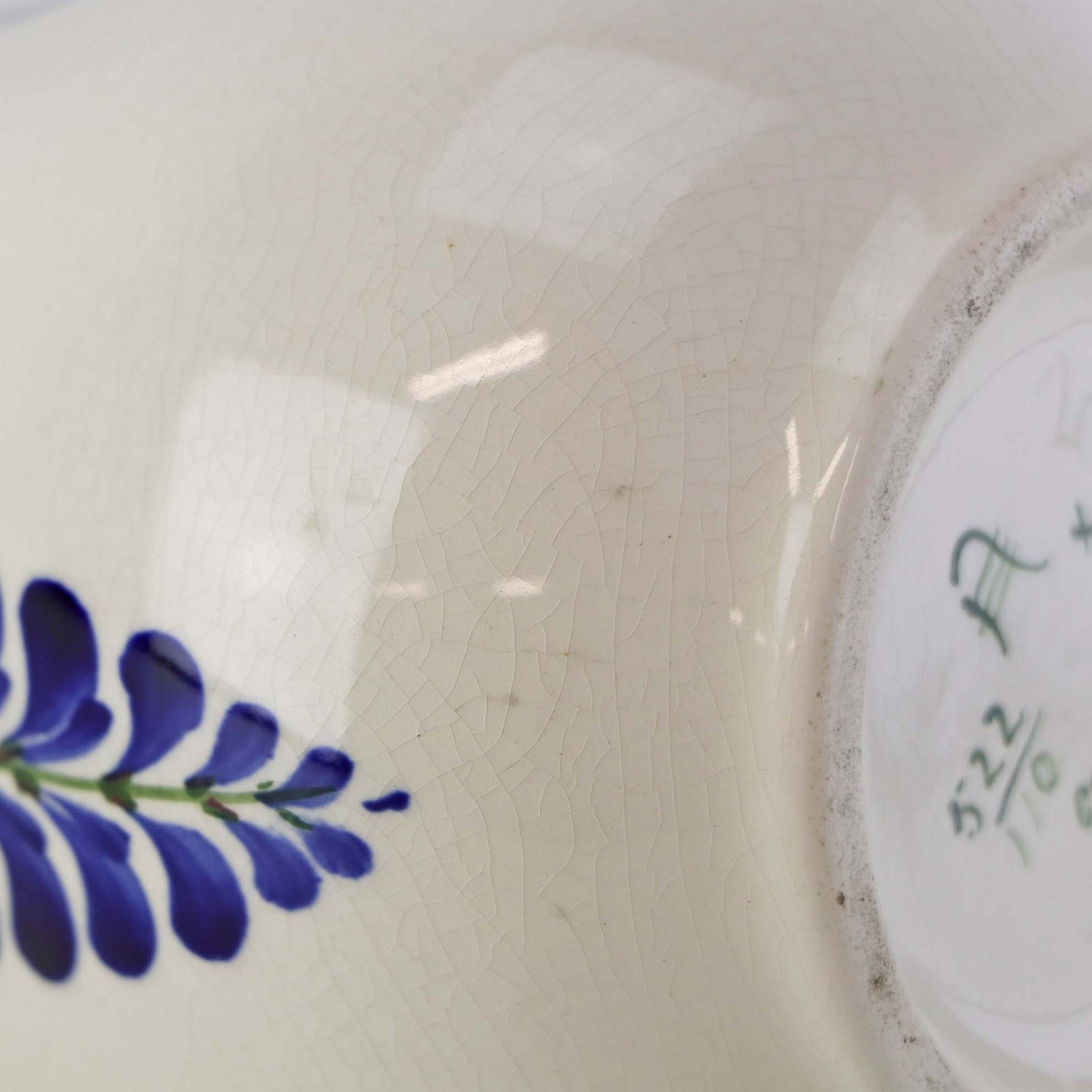Fajancestel med dekoration af ranker af blåregn og blade på lys baggrund afsluttet med kant af runde blå pletter.
