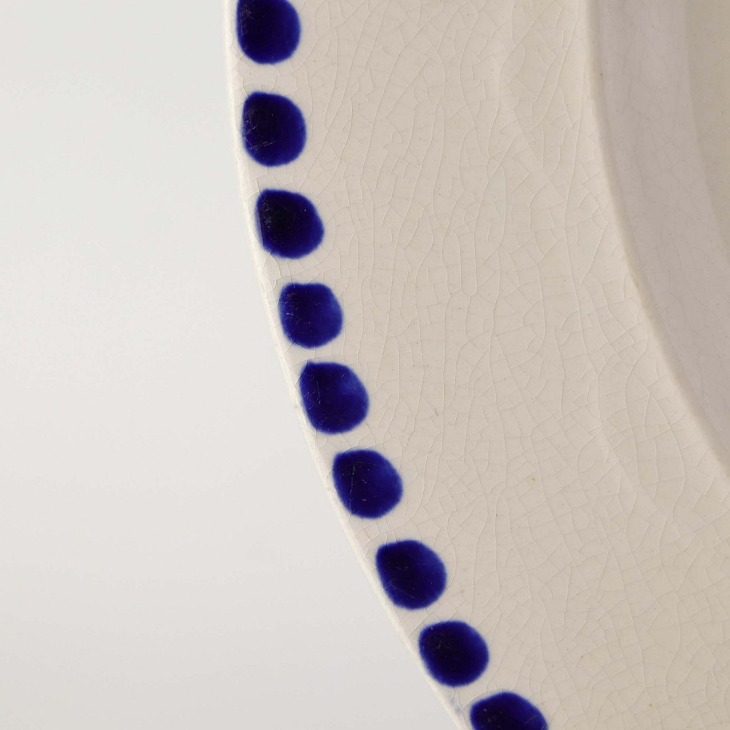 Fajancestel med dekoration af ranker af blåregn og blade på lys baggrund afsluttet med kant af runde blå pletter.