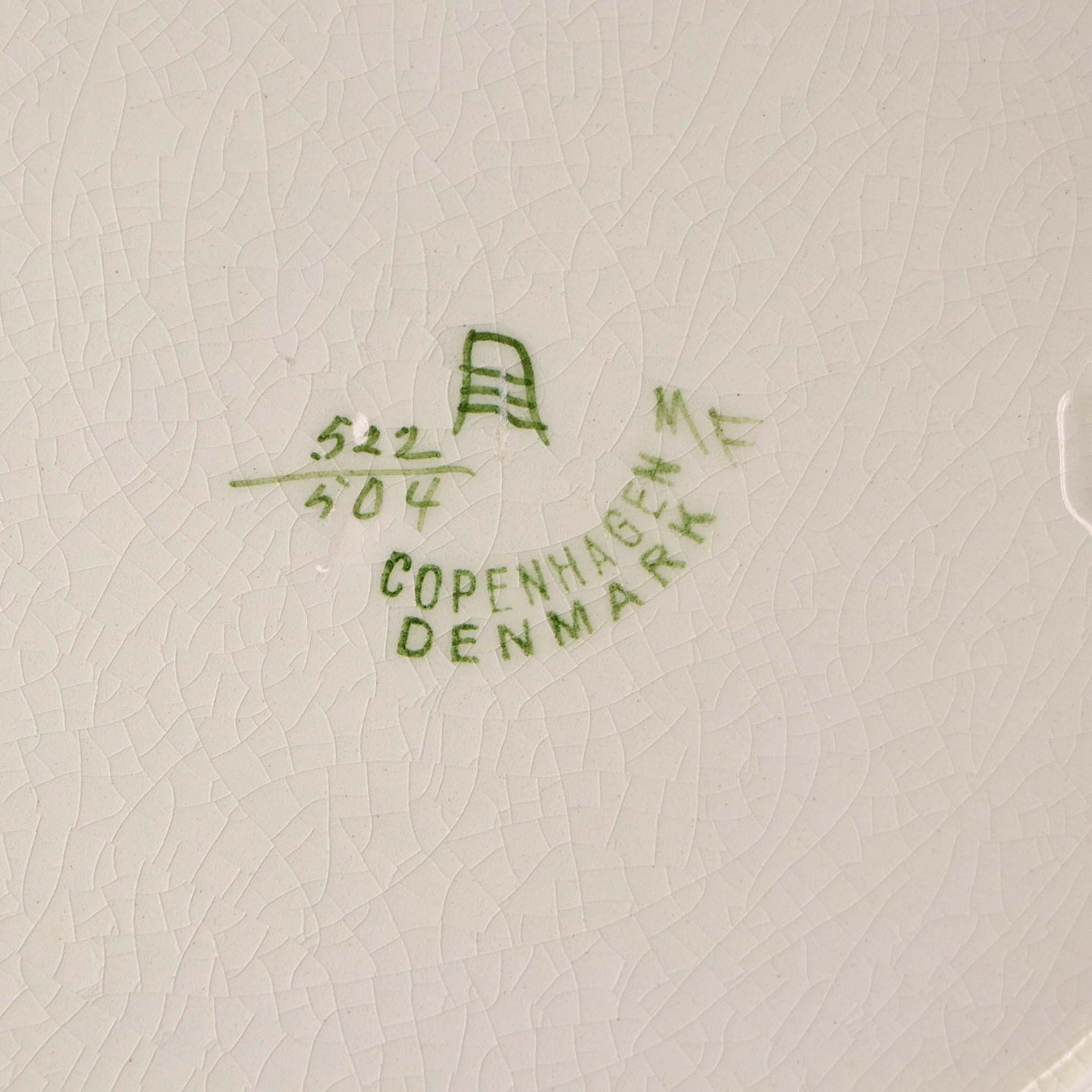 Flad middagstallerken i fajance fra stellet Blåregn. Stellet er fremstillet i perioden år 1903-1933. Nr. 522/504