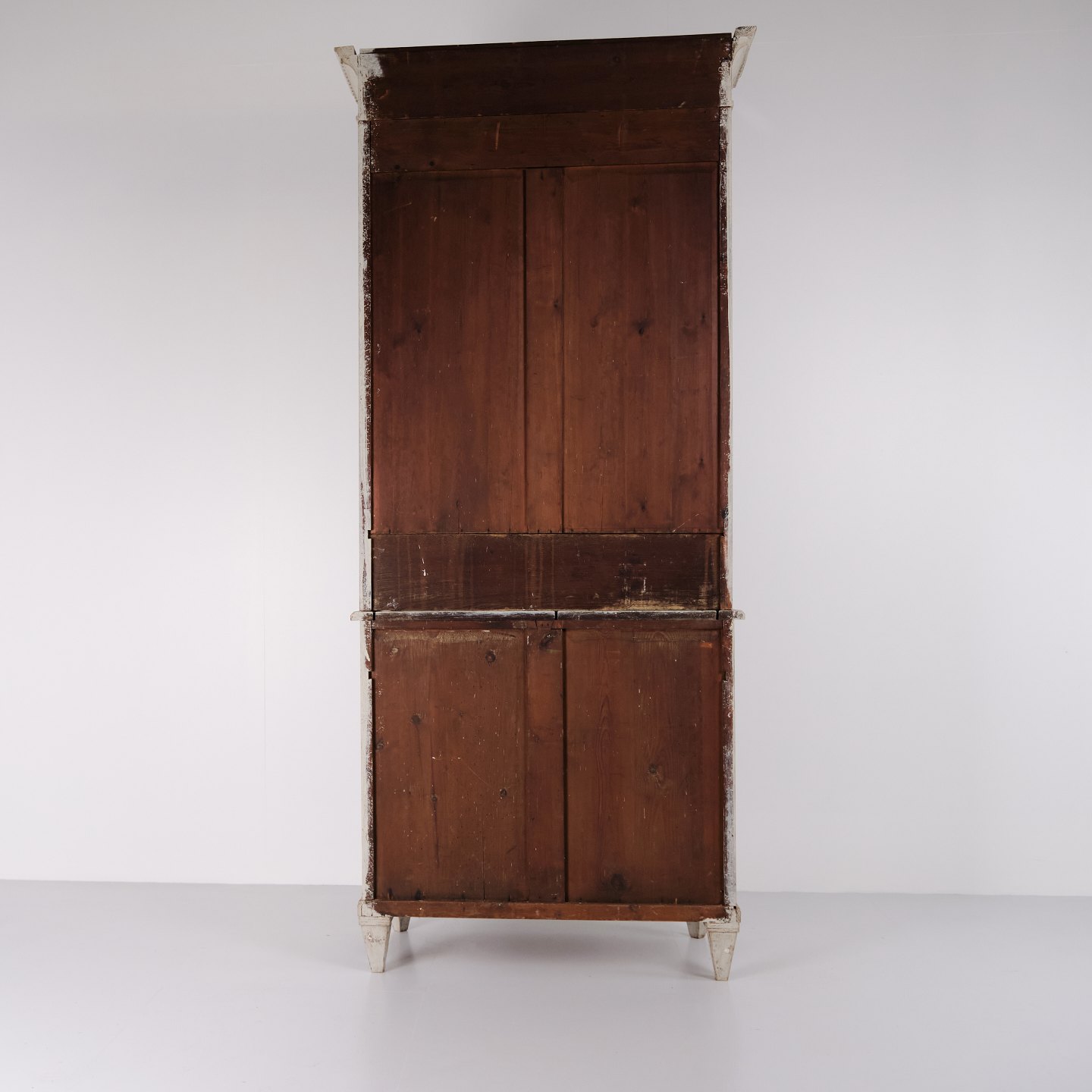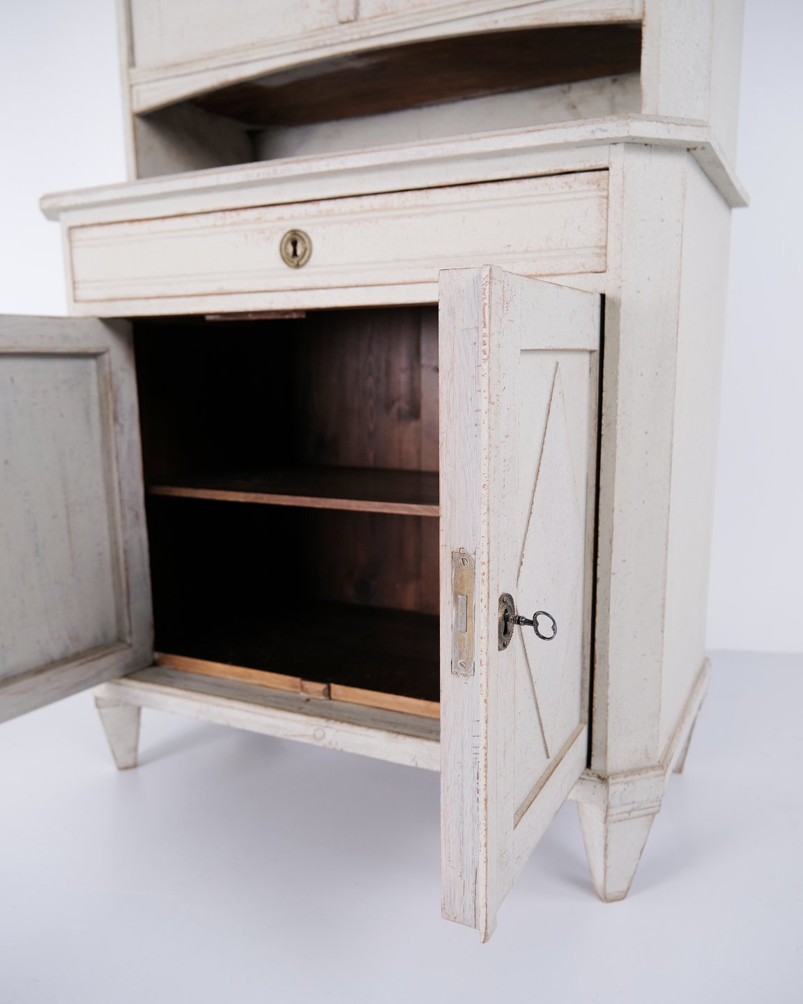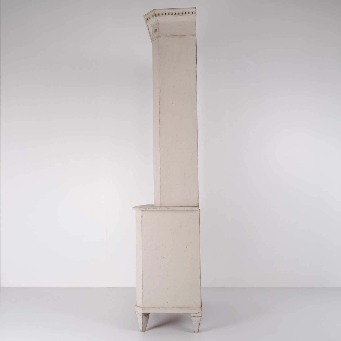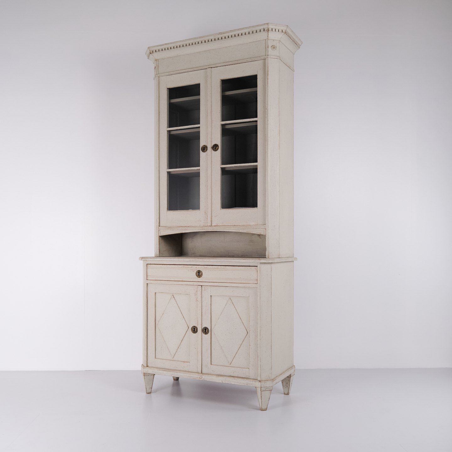 Großer schwedischer Vitrinenschrank aus der gustavianischen Periode, um die 1790er Jahre. Glastüren, Regale und Schublade.Der Schrank steht auf eleganten, konischen Beinen und besitzt einen oberen Teil mit Glastüren, der ihm ein leichtes und klassisches Erscheinungsbild verleiht. Im Inneren befinden sich vier Regalböden im Vitrinenteil, während der untere Teil sowohl eine praktische Schublade als auch Stauraum bietet.