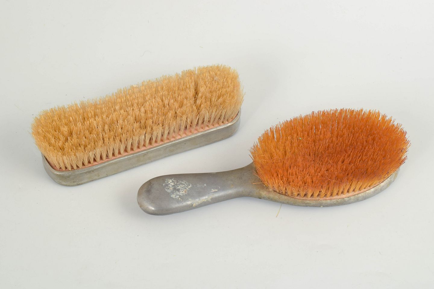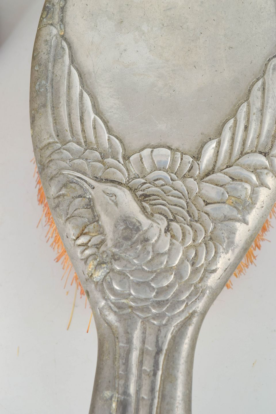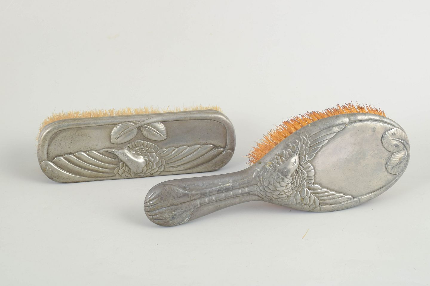 Mogens Ballin "Hejre" børstesæt.Børstesæt i tin udført i jugendstil med reliefdekoration af hejre og stiliserede naturmotiver. Består af to børster med dekorative skaftformer. Model Hejre.