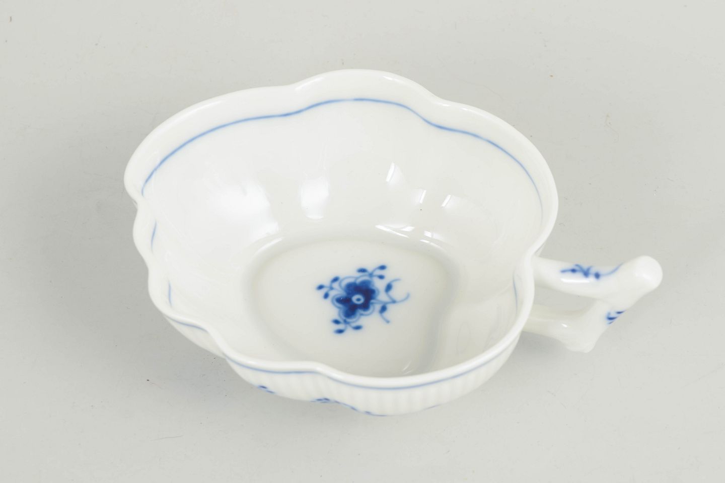 Lille fad med hank i håndmalet porcelæn fra Musselmalet Riflet med klassisk underglasurdekoration i koboltblå og riflede sider. Model 101/150. Første sortering. Fremstillet 1985–1991.