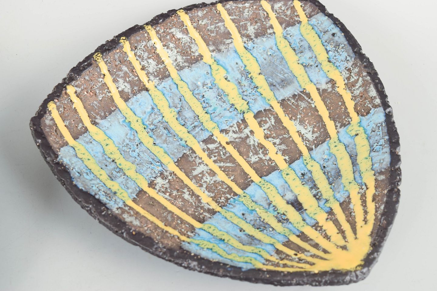 To mindre ovale keramikfade model 2548, udført i stentøj med reliefdekoration og flerfarvet glasur i blå og gule nuancer.