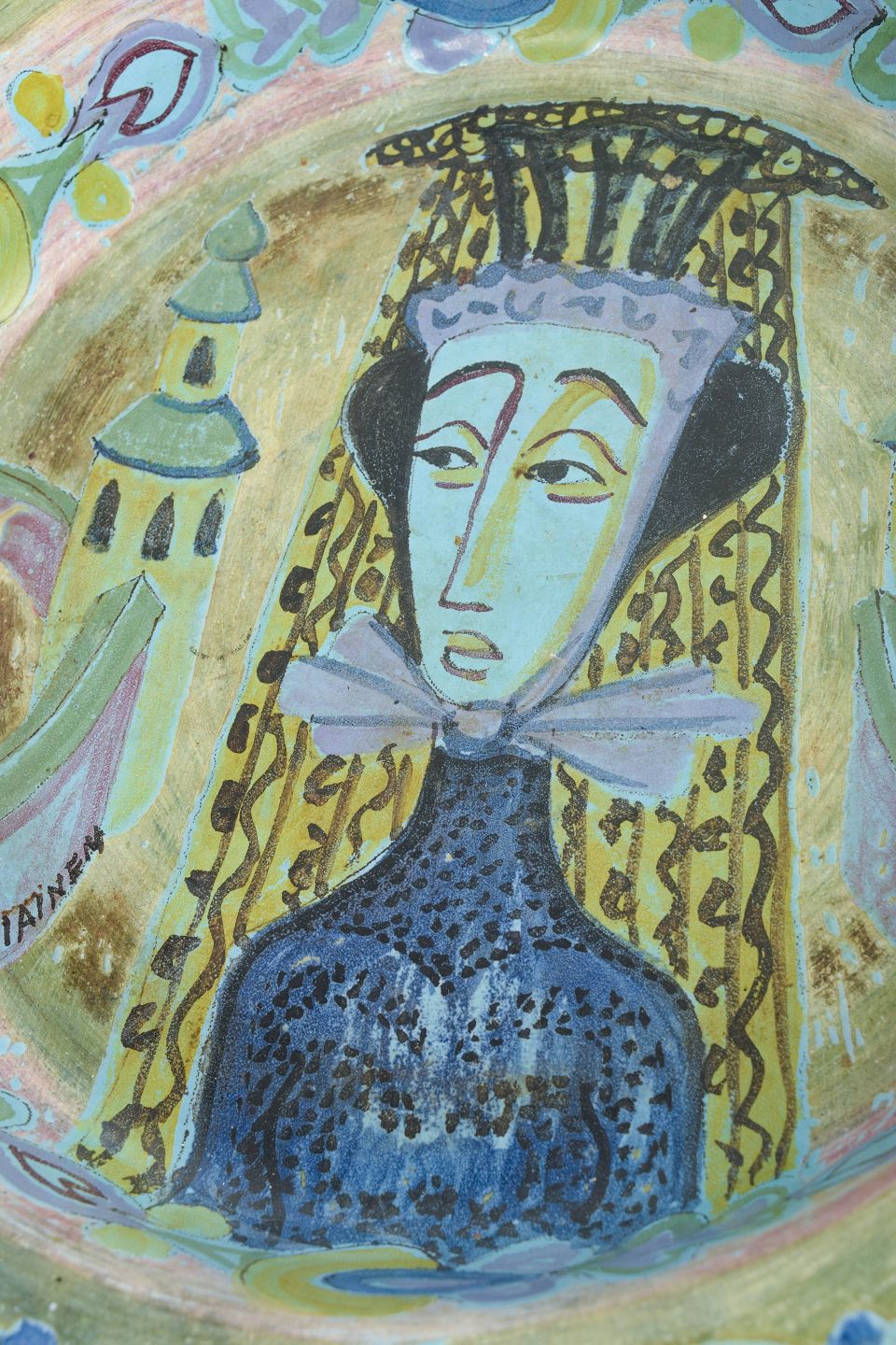 Birger Kaipiainen for Arabia, stor unika skål.Stor hånddekoreret keramisk skål med bølget rand og polykrom dekoration forestillende stiliseret kvindefigur omgivet af ornamentale motiver.