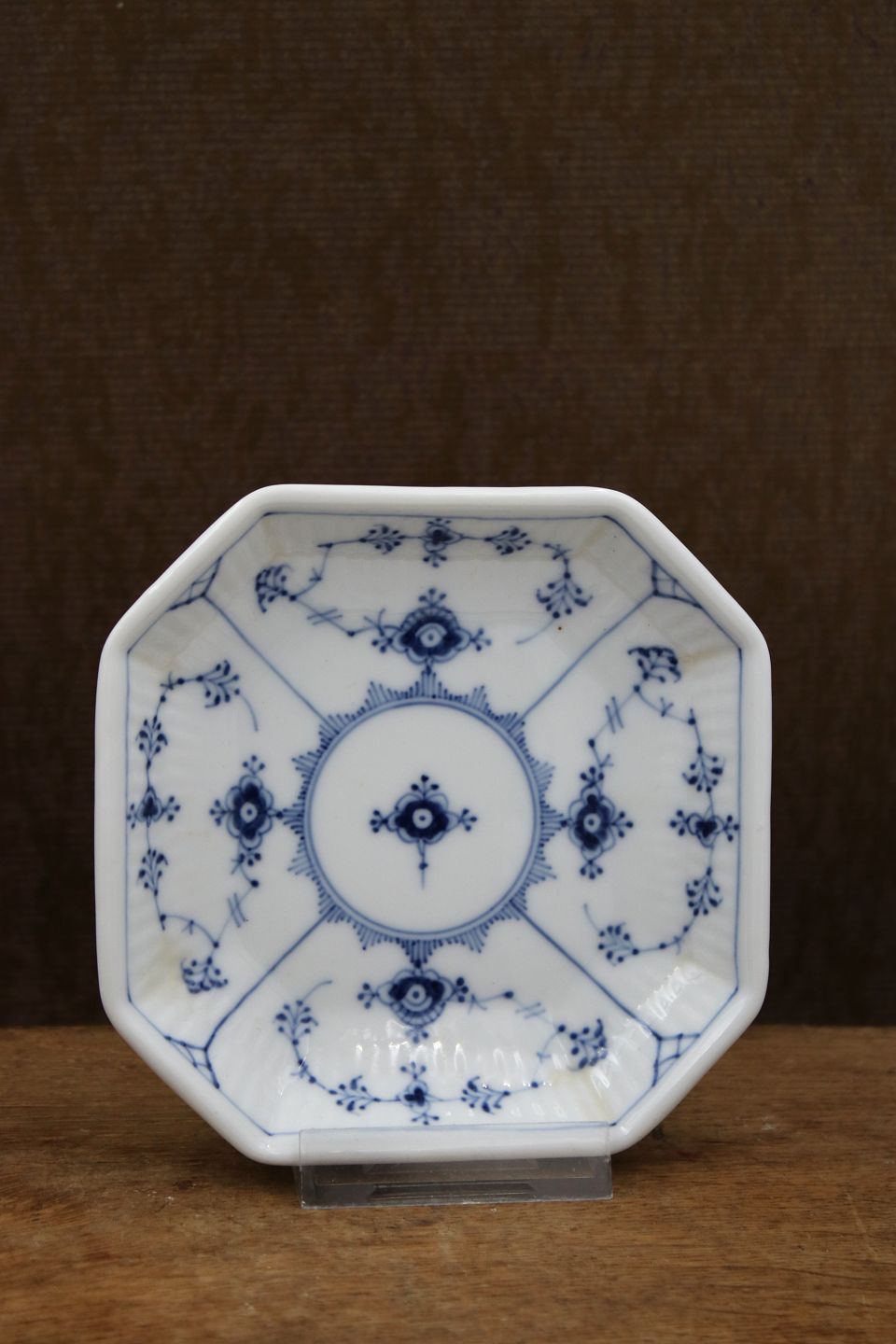 8 kantet sættefad i Musselmalet Riflet fra Royal Copenhagen. Dekorationsnummer: 1/229. 13x13cm. 1.sort. fra 1923-28.