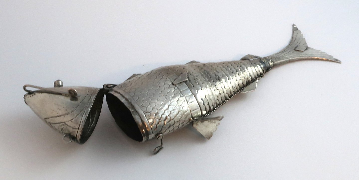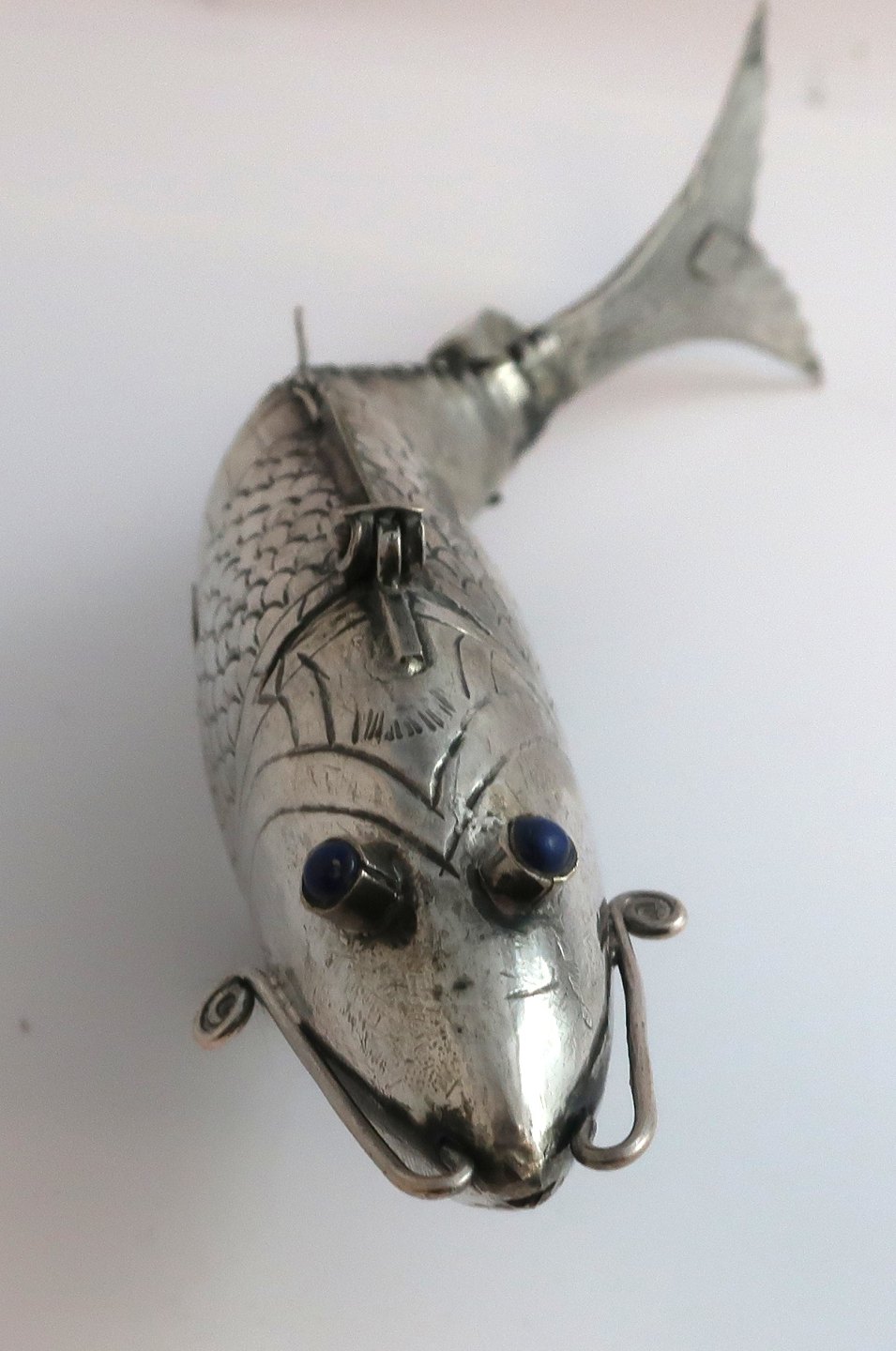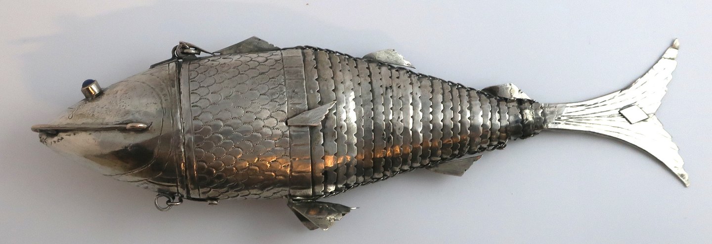 Silbernes vinagrette in Form eines Fisches mit blauen Steinen. Länge 23,5 cm