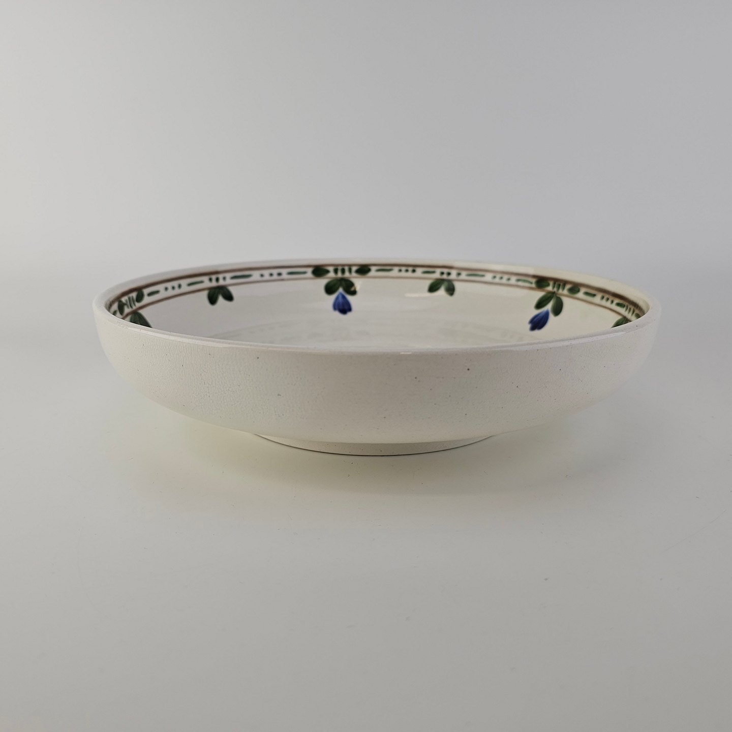 Rundt fad i kunstfajance med dekoration af blå blomster