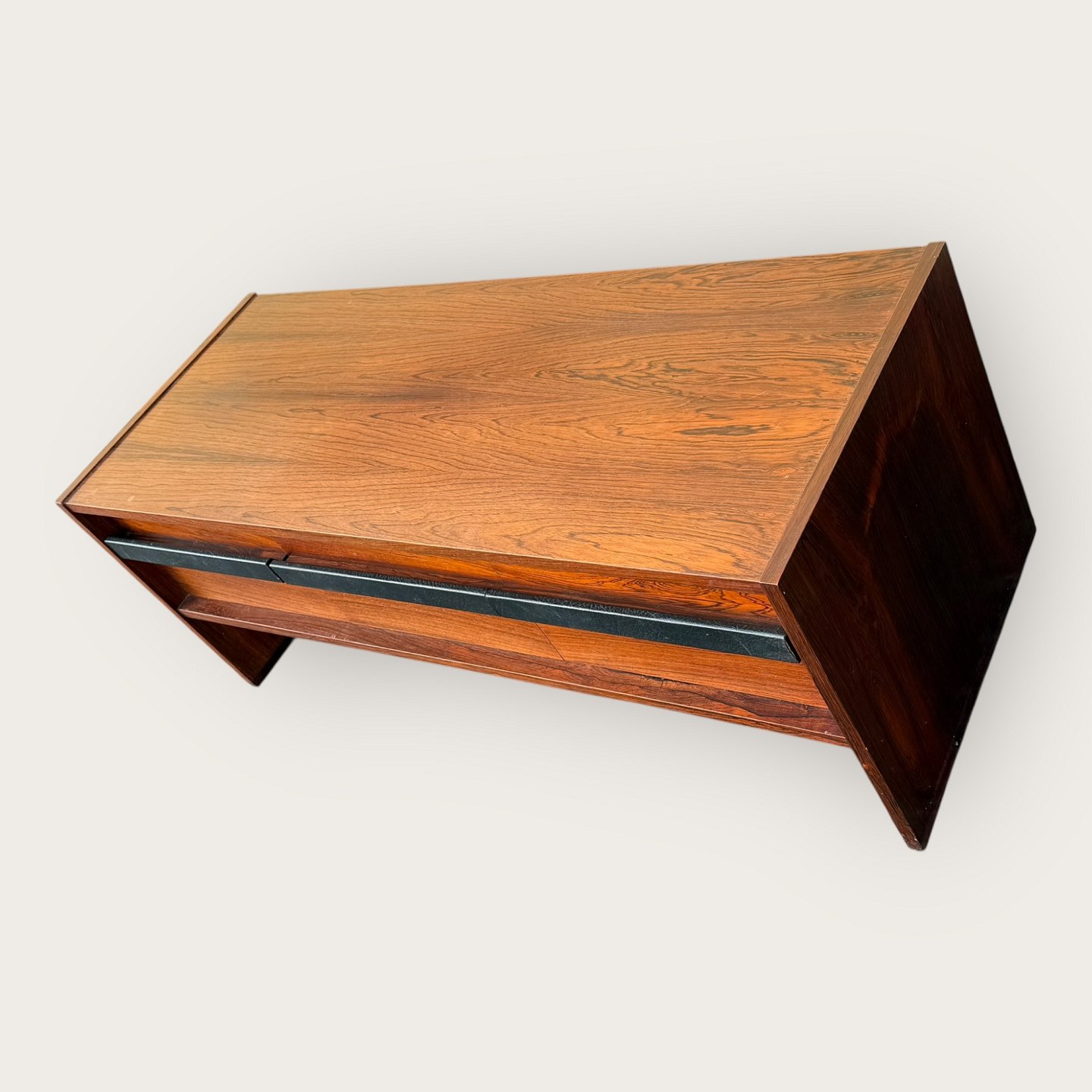 Niedriges Sideboard aus Palisanderfurnier, drei Schubladen mit lederbezogenen Griffen, nicht mehr im Sortiment von Illums Bolighus, Maße: H x B x T 46 x 116 x 45 cm, bildete zusammen mit dem Palisanderspiegel (Artikelnummer 632831) ein großes Flur-Ensemble. *In gutem, gebrauchtem Zustand mit wenigen Gebrauchsspuren.*