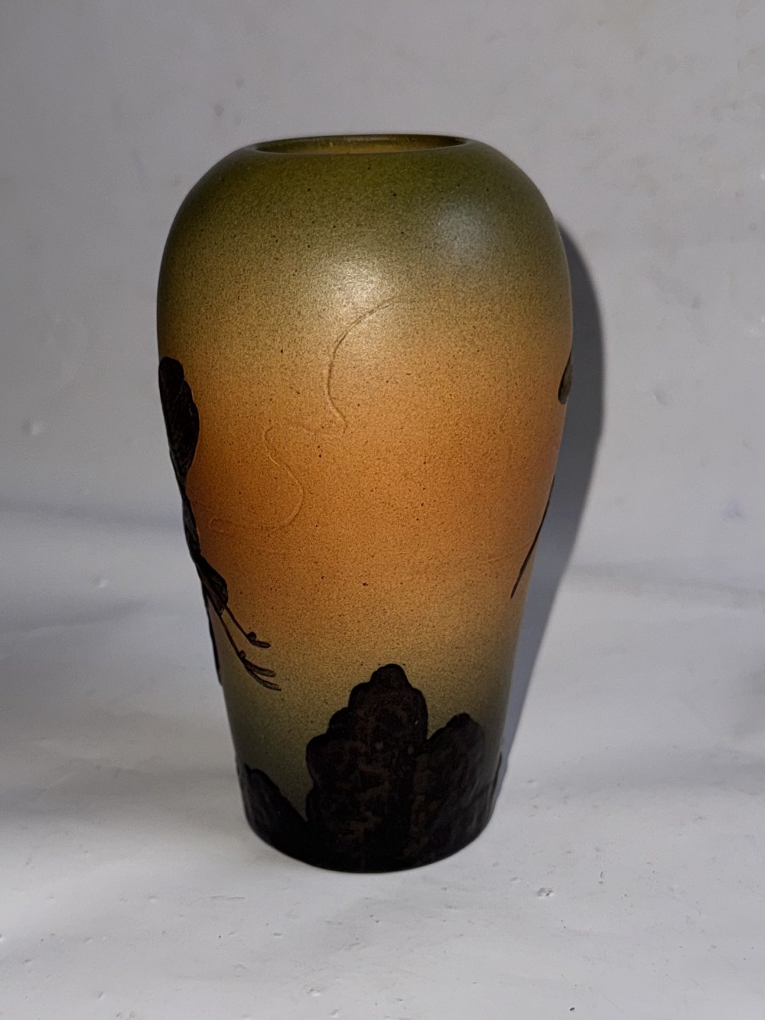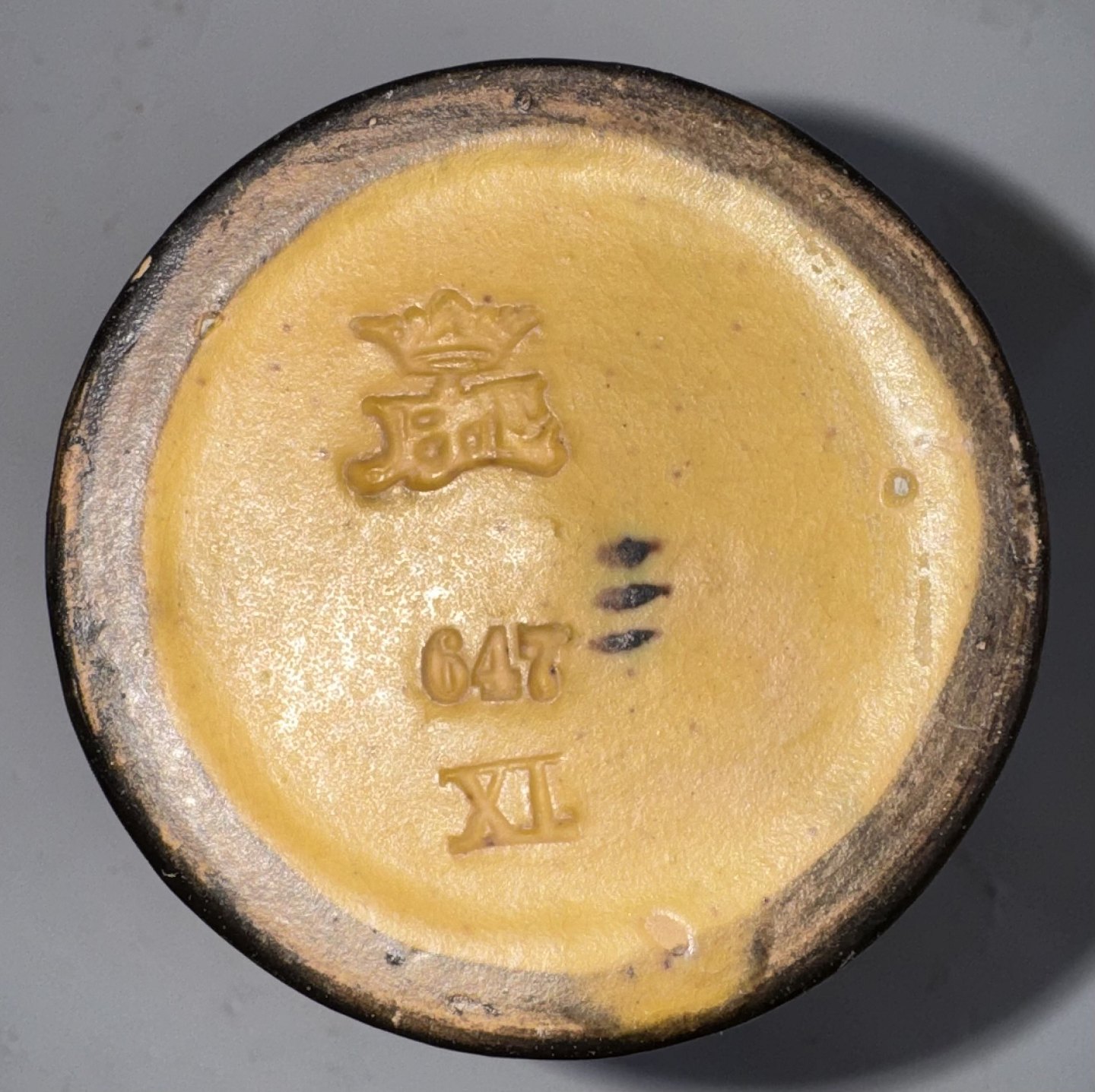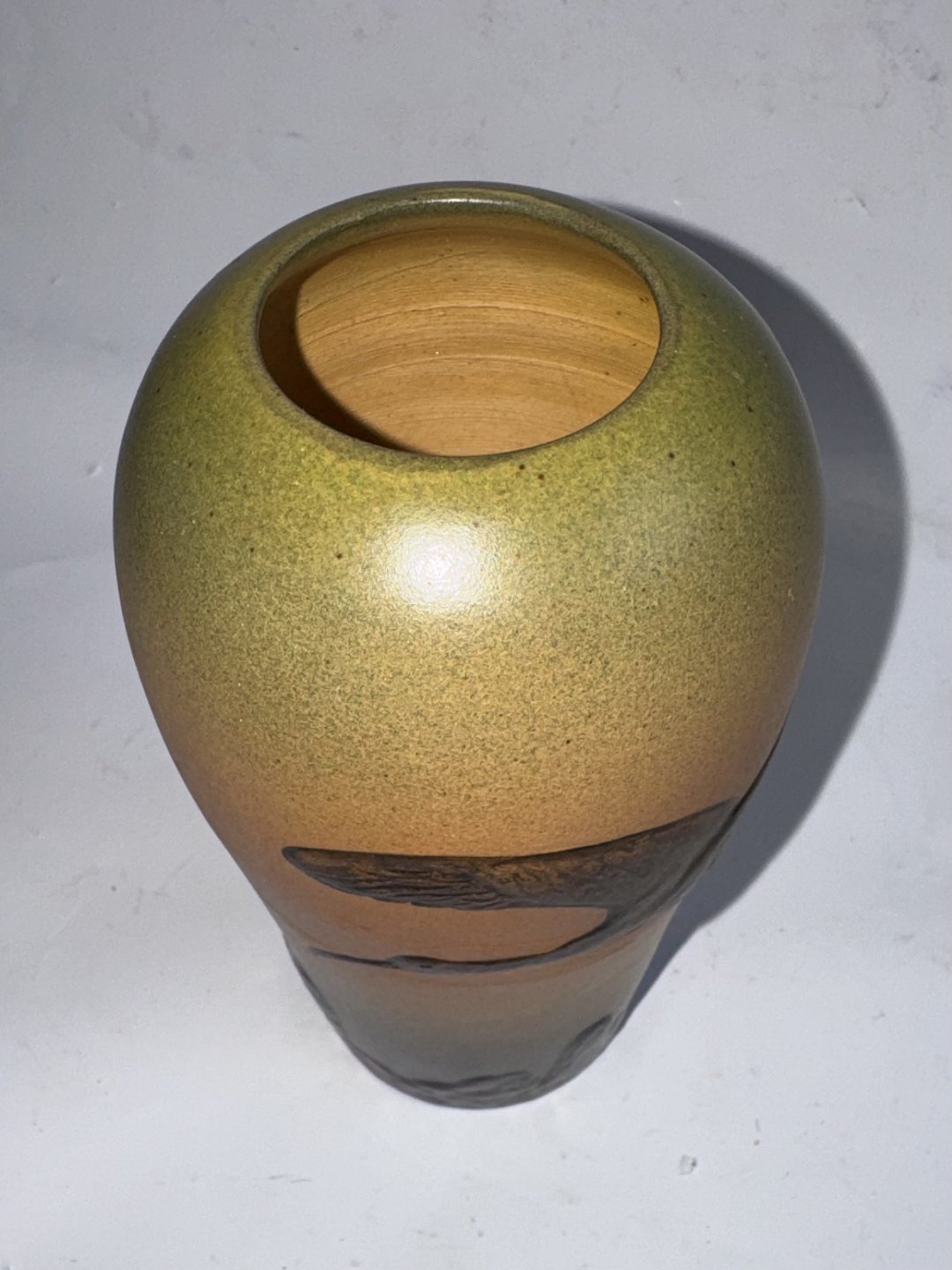 Vase i keramik fra den københavnske lervarefabrik Peter Ipsen ca. 1925. Dekoreret med en stor flyvende fugl. I god stand. Lille “nålestik” på bundens kant (se foto). Fabriksmærket på bunden med P. Ipsen Enke logo (krone over PIE) samt modelnummer 647. H. 14,7 cm.