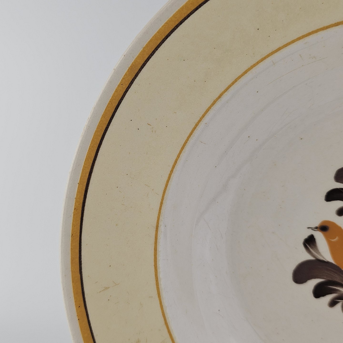 Hvidt fajancestel i stelform G med motiv af en orange og brun fugl og kant.